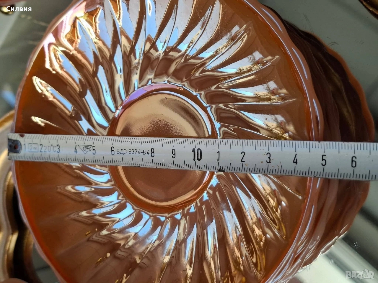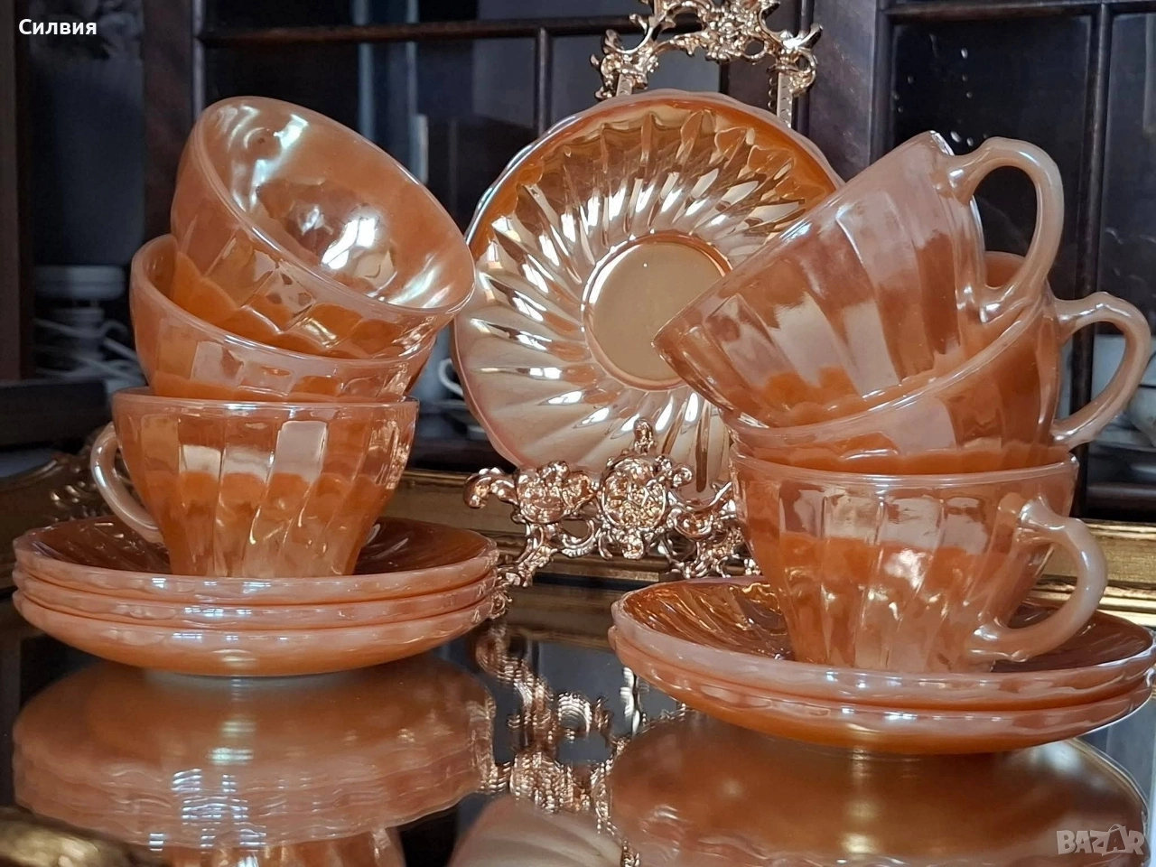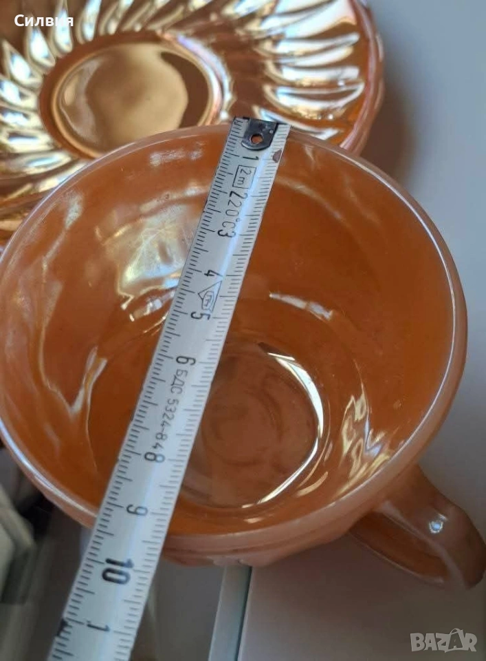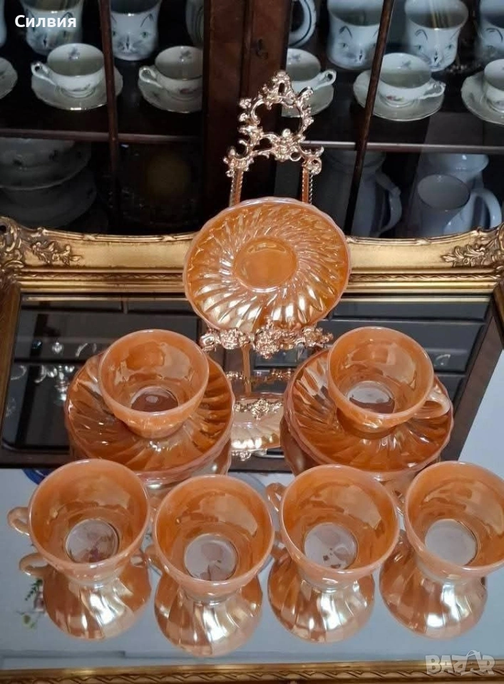 Винтидж комплект Anchor Hocking Fire-King Комплект от 6 чаши с чинийки – изработени от прочутото огнеупорно стъкло Fire-King на Anchor Hocking. Комплектът впечатлява с релефни лъчи по чинийките и фин гофриран рисунък на чашите, които улавят светлината и преливат в топли нюанси. Вместимост на чашите: 200 мл – перфектни за кафе, чай, горещ шоколад или ароматно капучино. Нежният прасковен цвят с перлен блясък и релефен слънчев орнамент придават неповторим ретро чар. Идеален избор за колекционери, ценители на американски винтидж дизайн или като ефектен акцент в дома. Истинска класика от средата на XX век – красота и история в едно с нежно прасковено стъкло с перлен, лъчезарен отблясък. Идеален за колекционери, любители на винтидж стила или като изискан акцент в ретро интериор. Една истинска находка за ценители на ретро стъкло от средата на XX век. •✽✧✽•°”˜🦋”°•✽✧✽•°”˜🦋”°•✽✧✽•°”˜🦋”°•✽✧✽•°”🦋˜”°•✽✧✽•