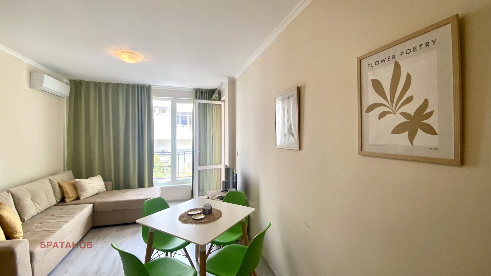 Апартаментът е разположен на 2-ри етаж с площ 56 м2, напълно обзаведен с мебели и техника.