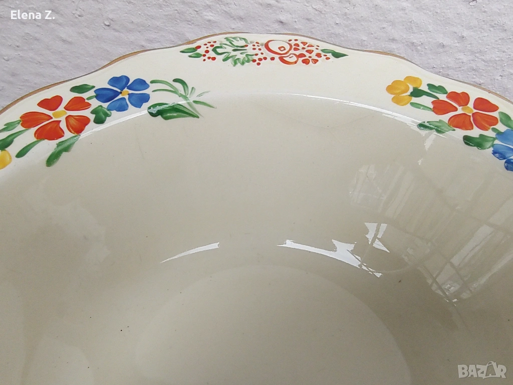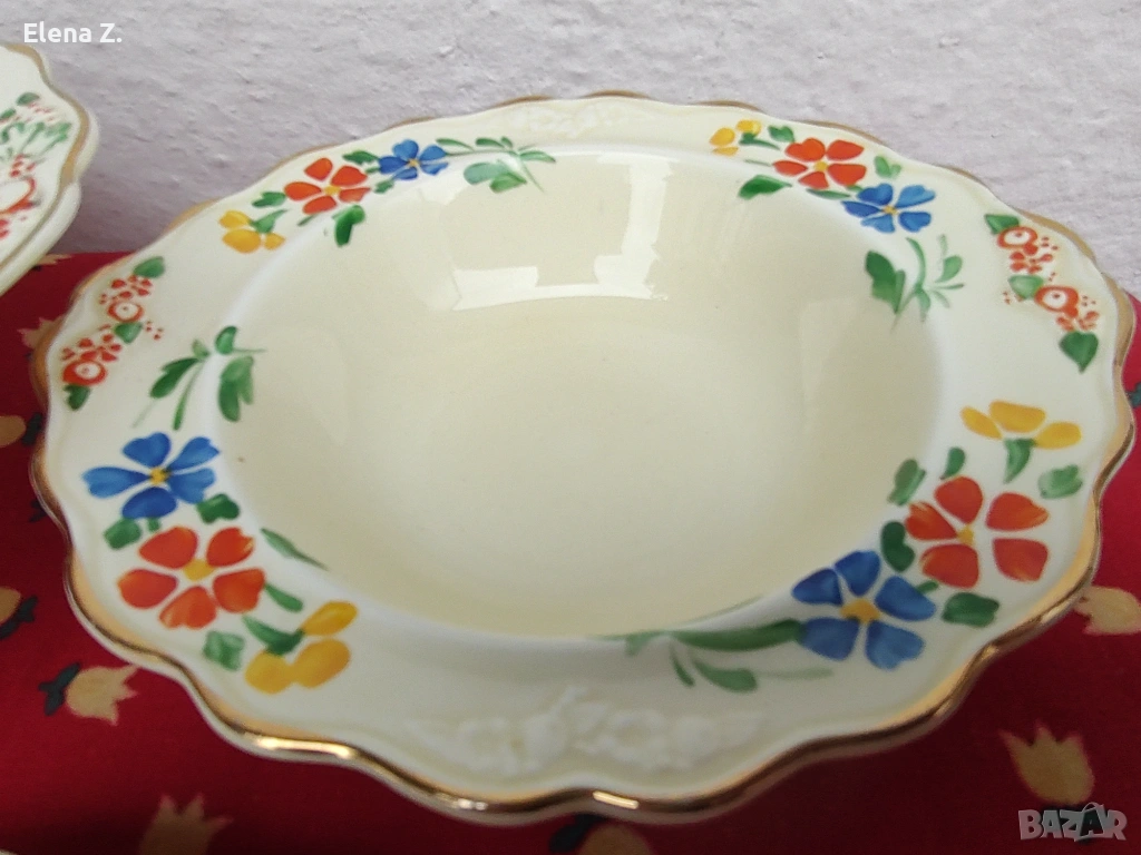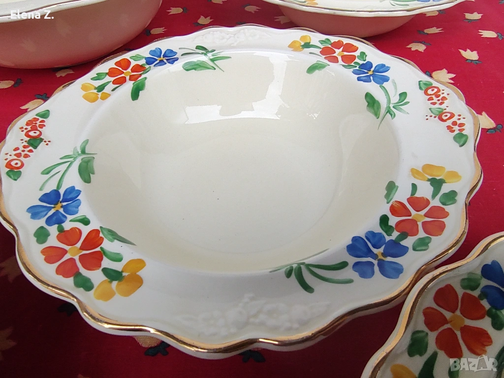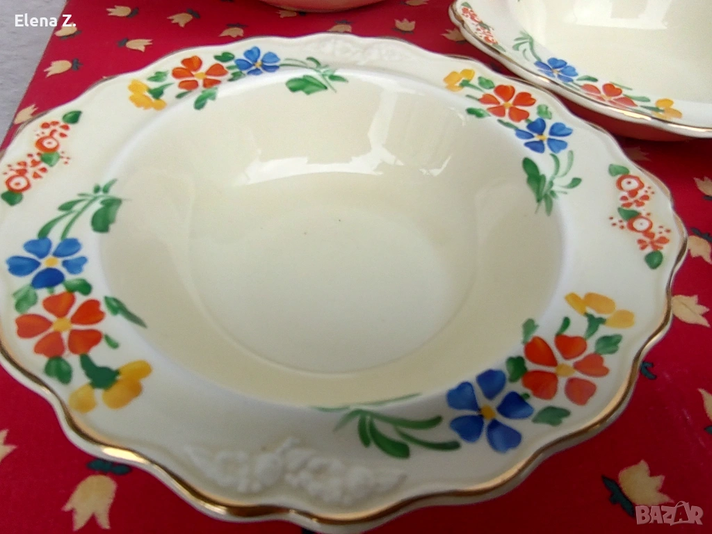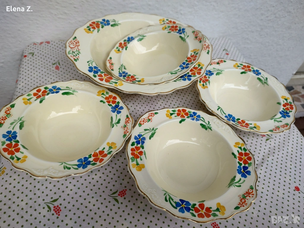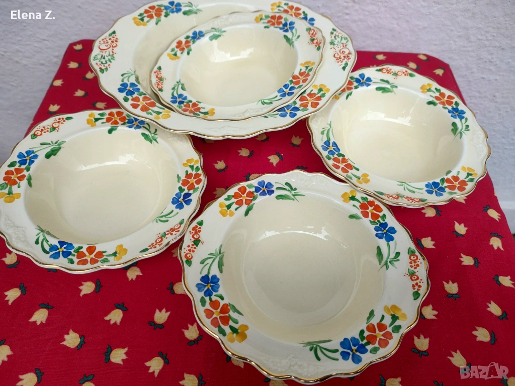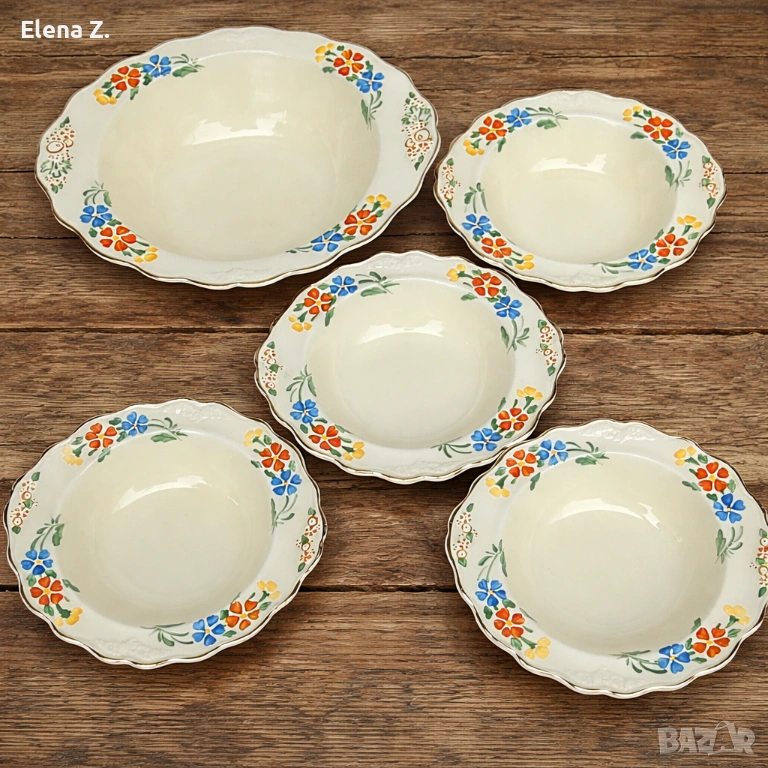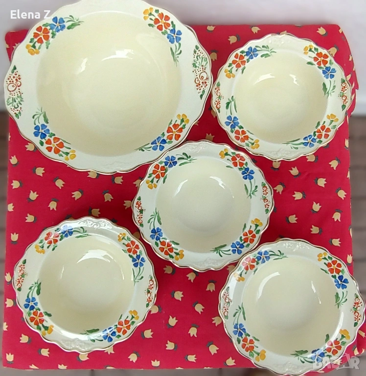 Предлагам комплект от вече невъзможни за откриване (поне за мен по книги и онлайн каталози) голяма купа 25см х 22см, височина 7см, и 4 малки купички 17 х 16см с височина 4см съдове в цвят слонова кост, златни къдрави кантове и красив релеф.