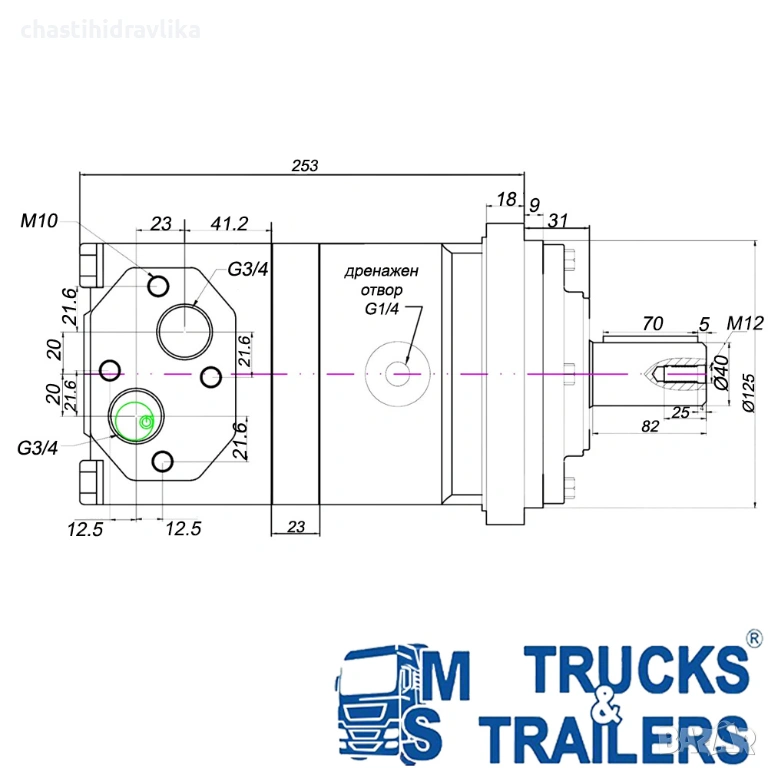 Присъединителните отвори на хидромотора са с резба G ½“, която отговаря на стандарта BSPP (British Standard Pipe Parallel).
