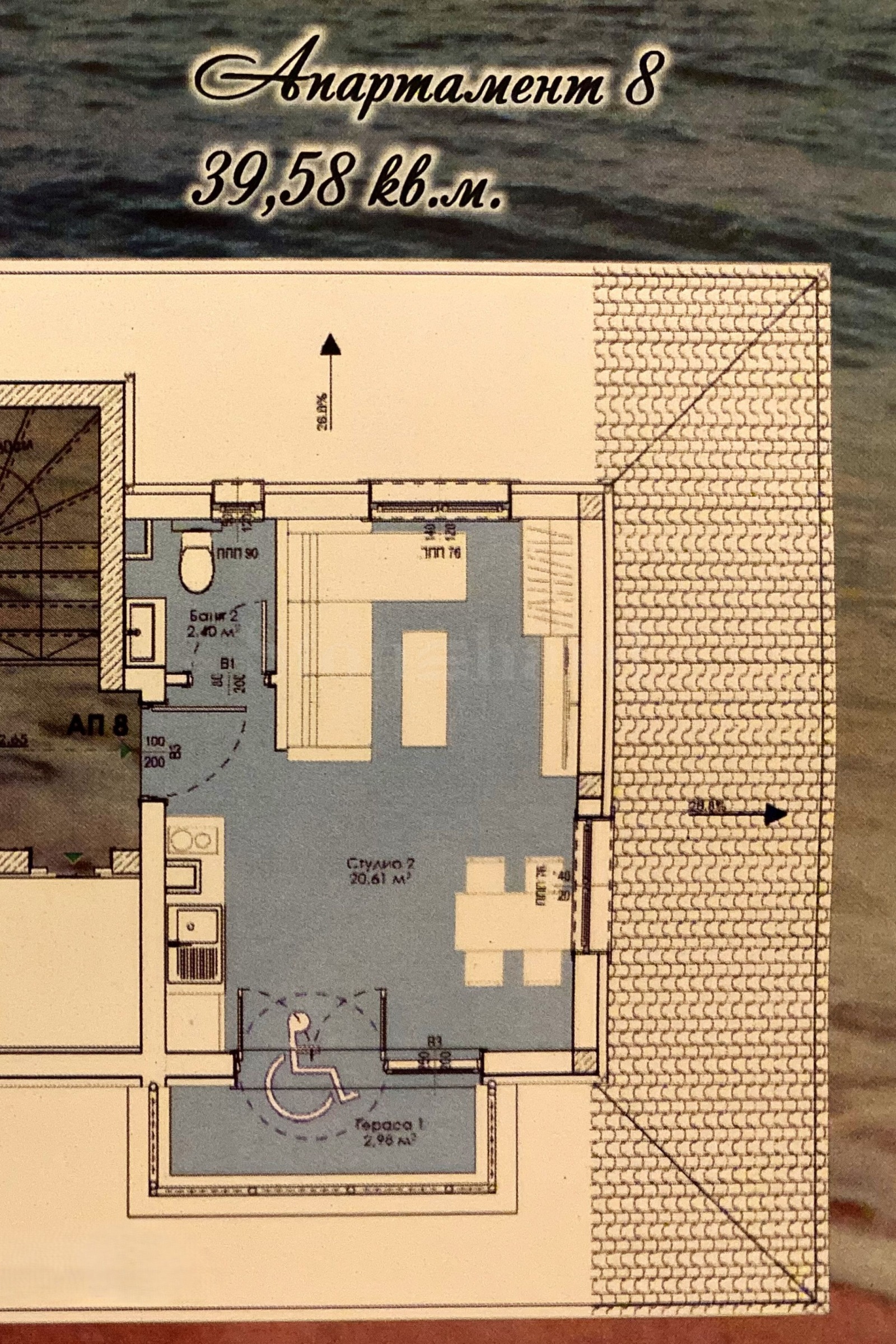 Имотът е с площ 39,58 кв.м, разположен на 4-ти етаж, с гледка към Странджа планина.