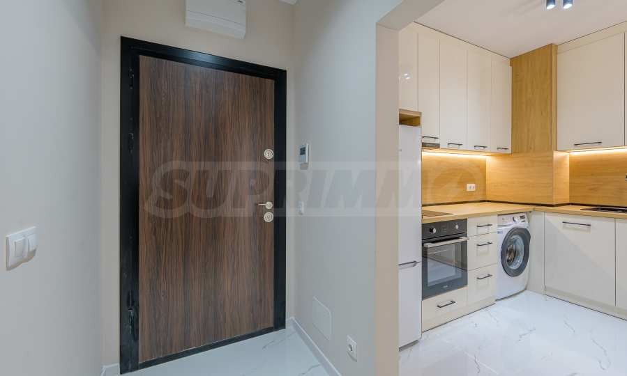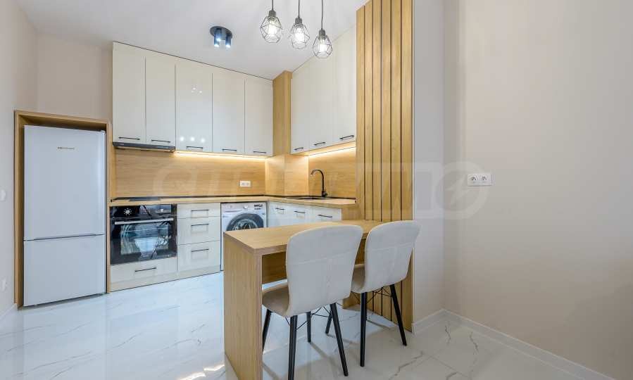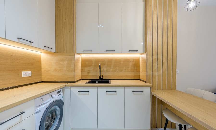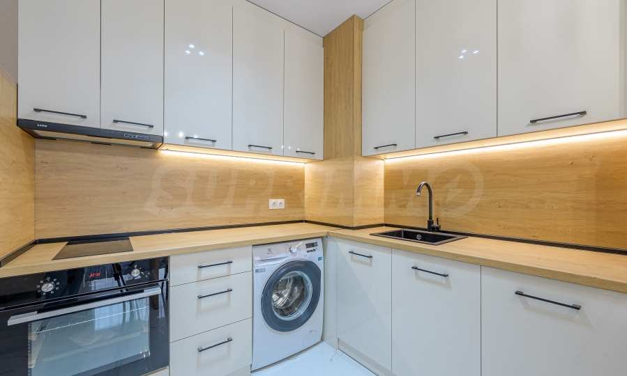 - Кухня, оборудвана с хладилник, фурна с котлони и пералня