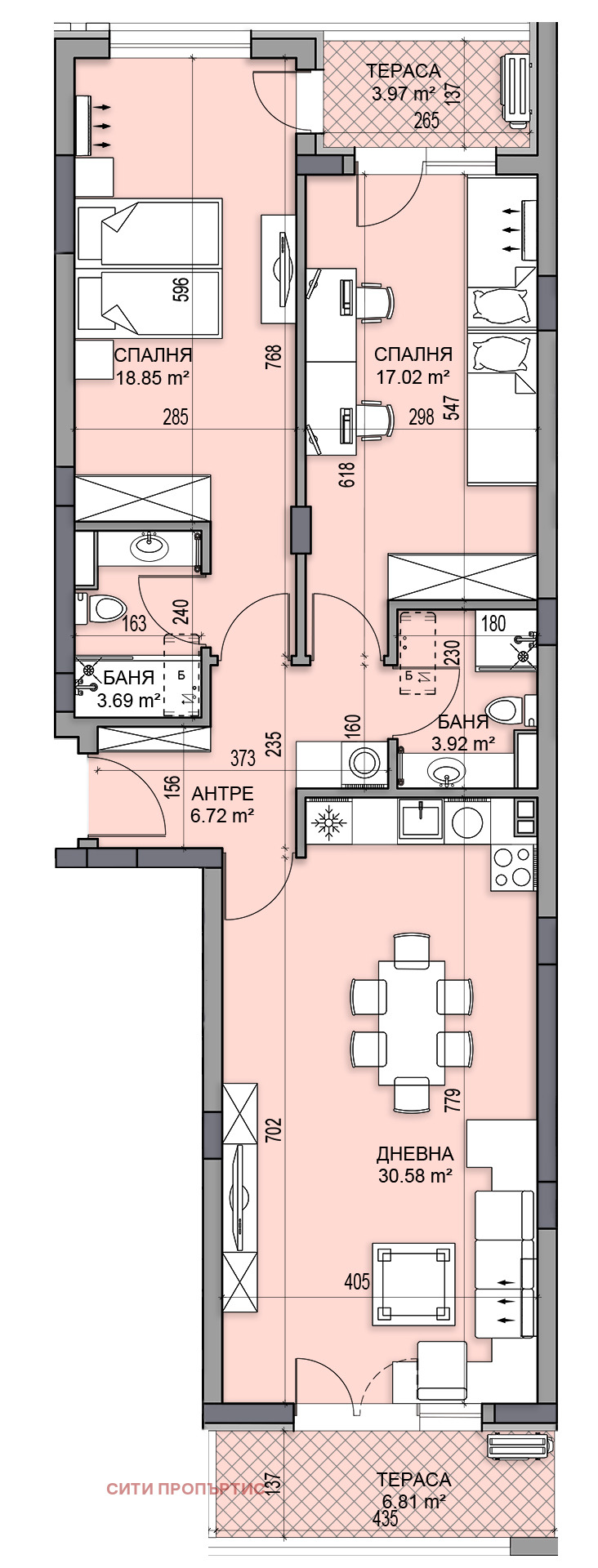 Апартаментът е на четвърти жилищен етаж, част от секция А и предлага функционална обща квадратура от 127,91 кв.м. Състои се от спалня (17,02 кв.м.), спалня (18,85 кв.м.), хол с кухня (30,42 кв.м.), баня с тоалетна (3,92 кв. м.), баня с тоалетна (3,69 кв.м.), антре (6,72 кв.м.), тераса (6,81 кв.м.) и тераса (3,97 кв.м.)