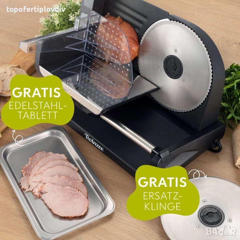 Мощен и остър: Благодарение на своя 150 W мотор, електрическият метален резач е особено ефективен и бърз и ви позволява лесно да режете всички видове храна.