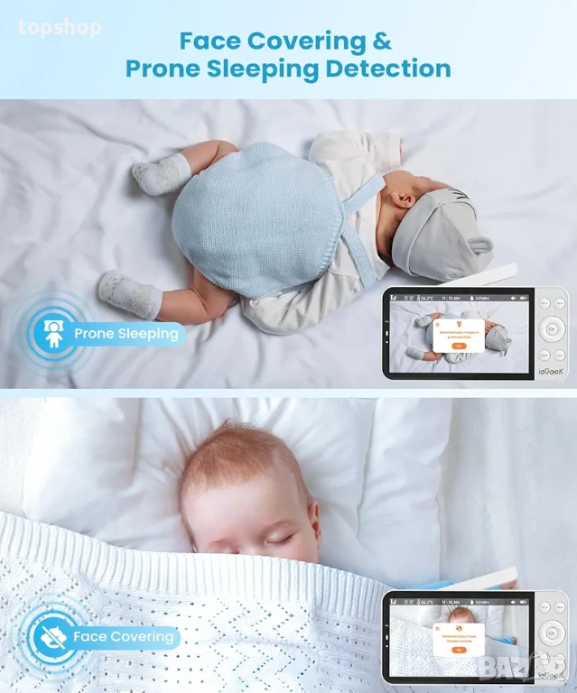 Интелигентни функции с изкуствен интелект за засичане на покриване на лицето обръщане по корем и плач