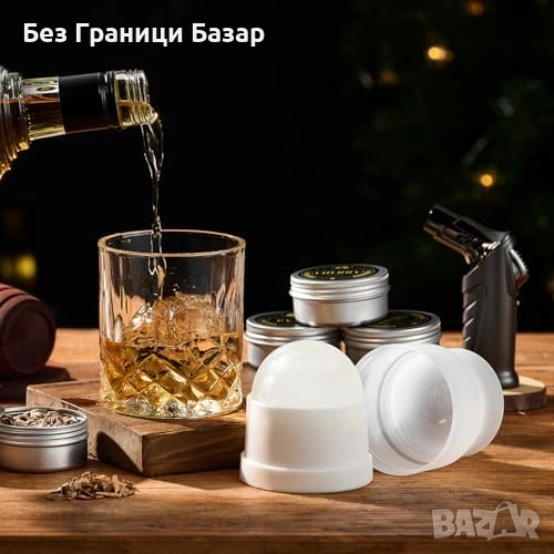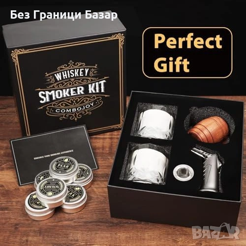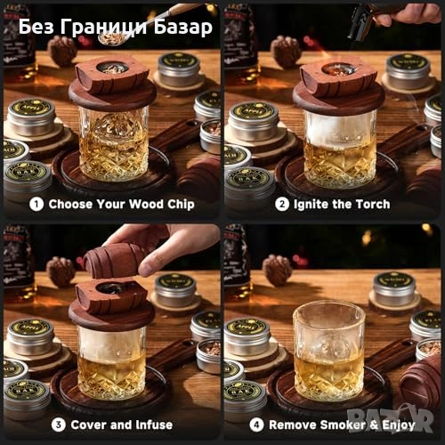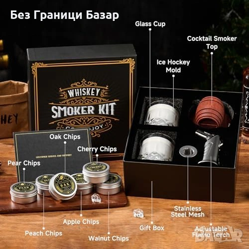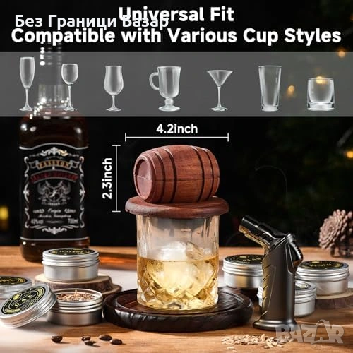 Нов Подаръчен комплект за опушване на бърбън коктейли с горелка 6 аромата 2 чаши