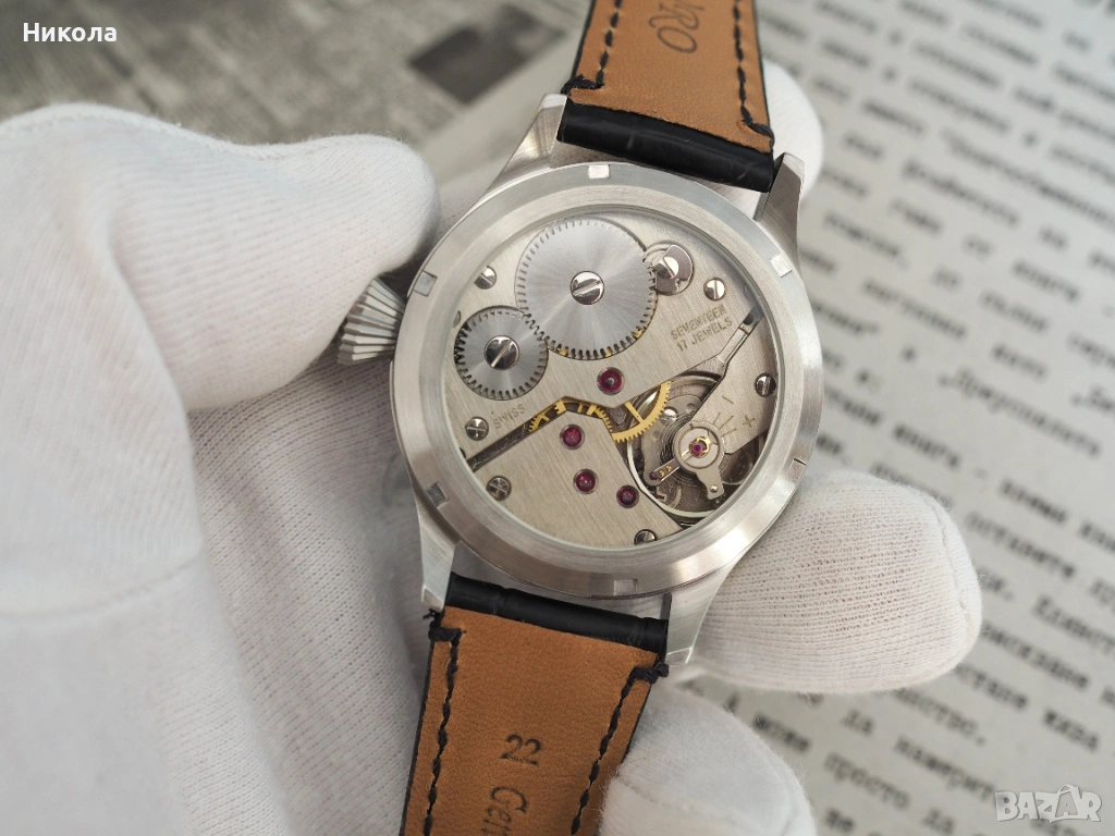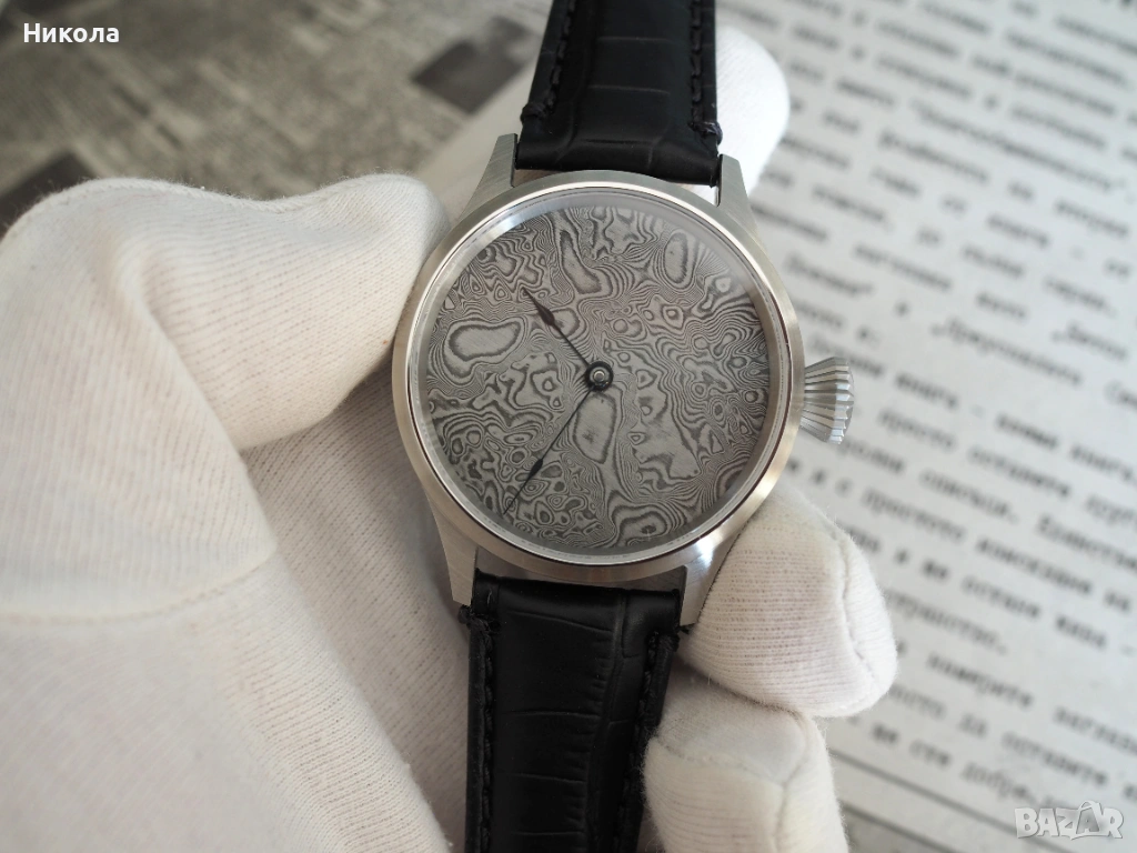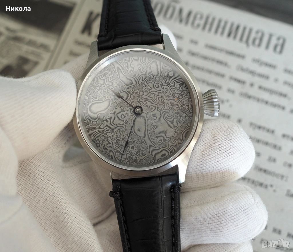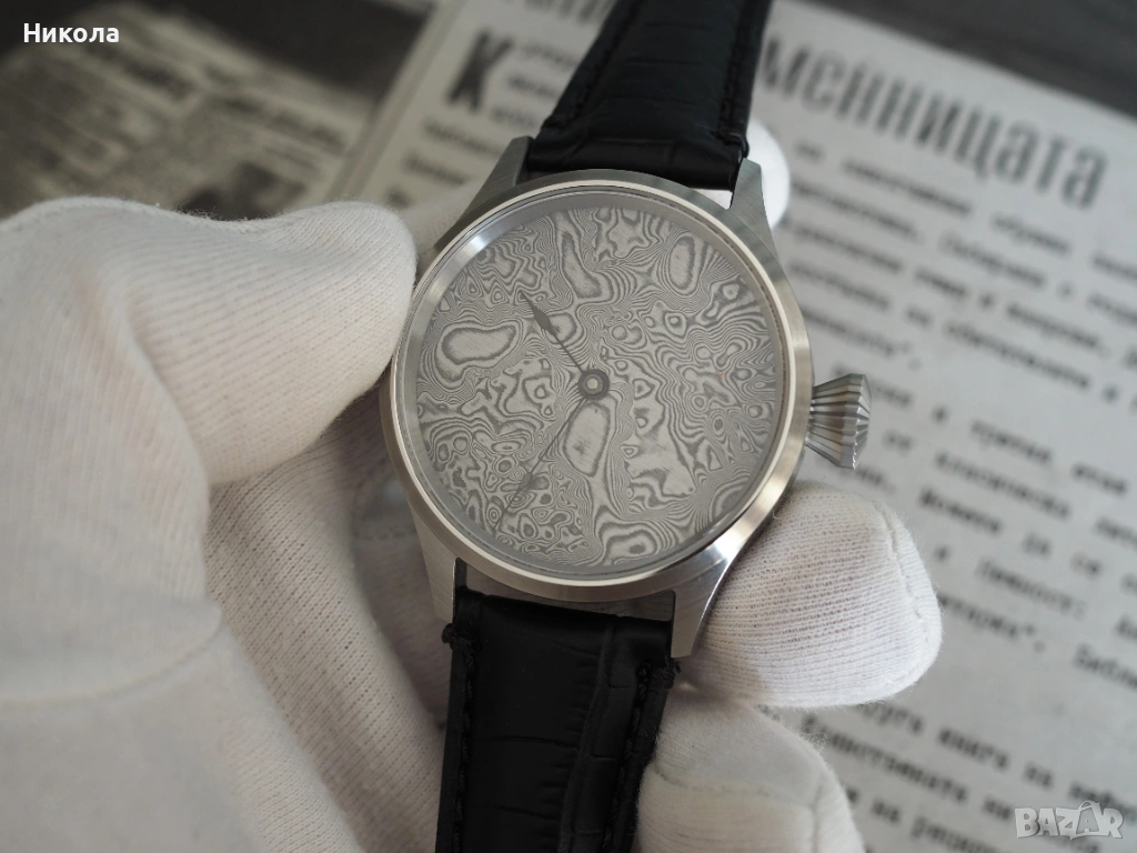 Механичен часовник с швейцарски механизъм ETA 6498 и ръчно изработен циферблат от неръждаема дамаскова стомана. Корпус от неръждаема стомана 44 мм с двоен сапфир. Впечатляващ и уникален часовник, който съчетава традиционното швейцарско часовникарство със съвременно художествено металообработване. Уникалният циферблат от гарантира, че няма два еднакви екземпляра, а механизмът от отдавна доказал се калибър.