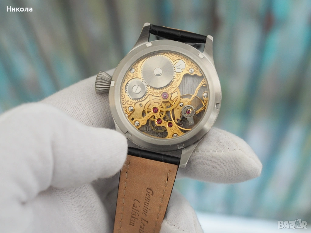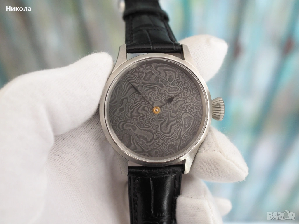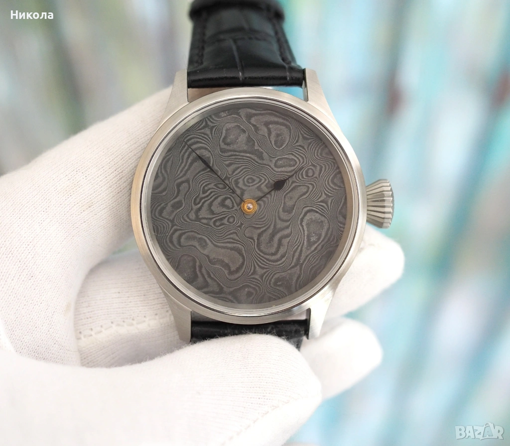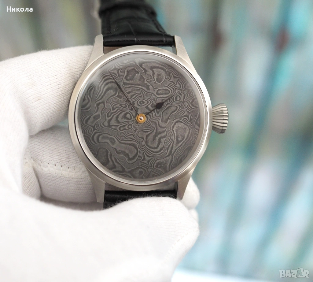 Механичен часовник с фабрично скелетиран швейцарски механизъм ETA 6498 и ръчно изработен циферблат от неръждаема дамаскова стомана. Корпус от неръждаема стомана 44 мм с двоен сапфир. Впечатляващ и уникален часовник, който съчетава традиционното швейцарско часовникарство със съвременно художествено металообработване. Уникалният циферблат от гарантира, че няма два еднакви екземпляра, а механизмът от отдавна доказал се калибър.