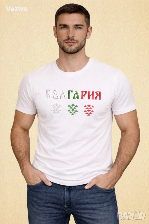 Стилна бродерия с надпис „България“ в цветовете на националния трибагреник, допълнена с традиционен фолклорен мотив. Комбинацията от бяло, зелено и червено носи усещане за принадлежност, традиция и гордост.