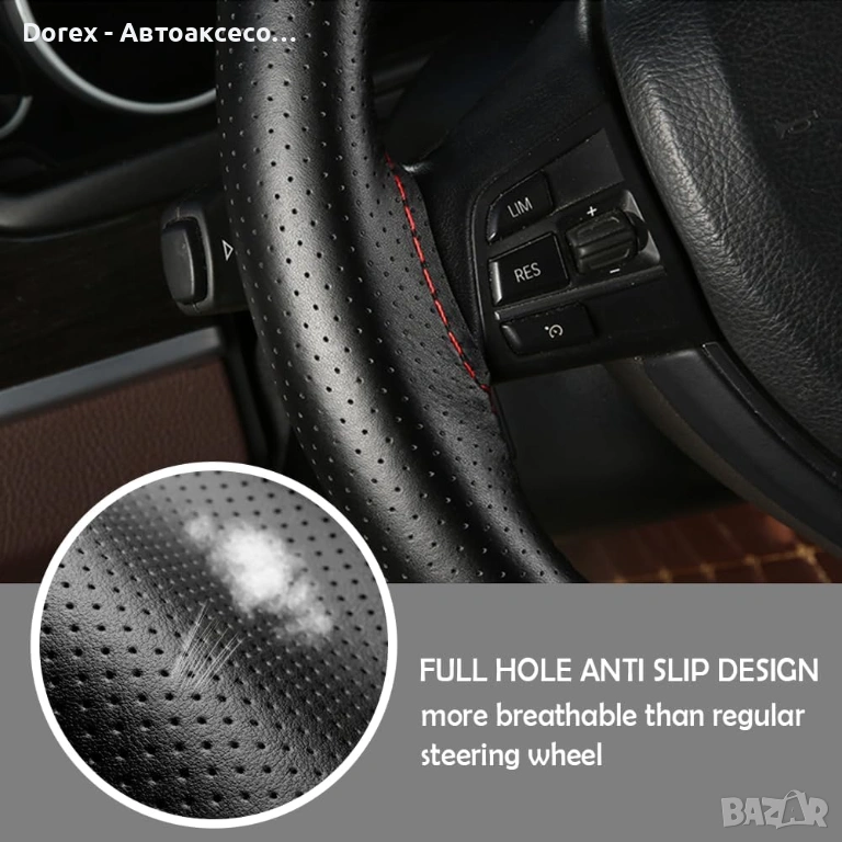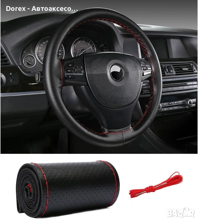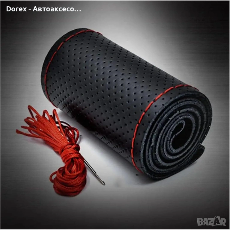 Стилен калъф за волан с перфориран дизайн и контрастен червен шев, който придава спортна визия на интериора. Осигурява отличен захват и комфорт при шофиране, като същевременно подобрява контрола върху волана.