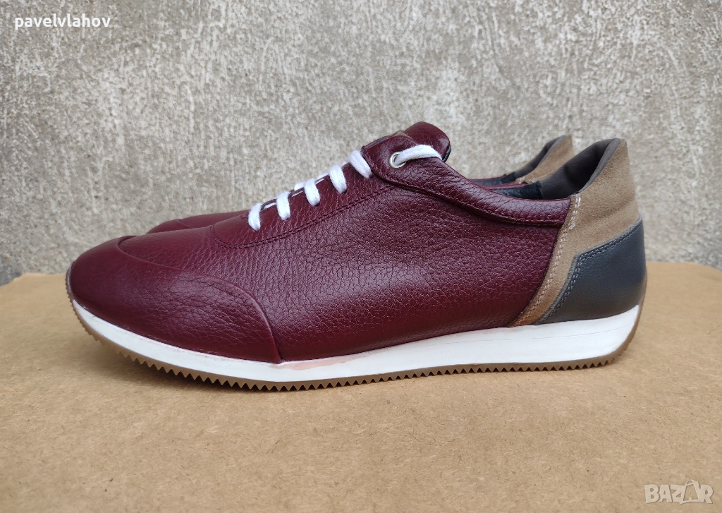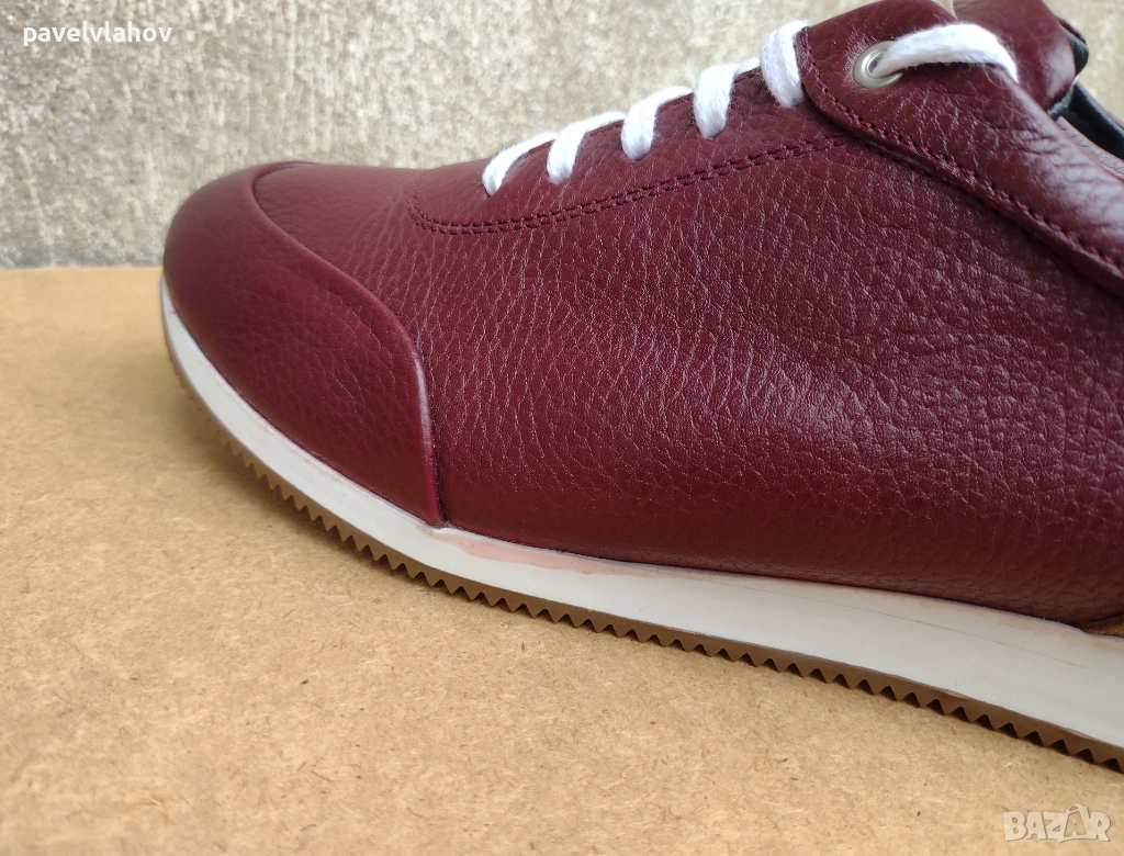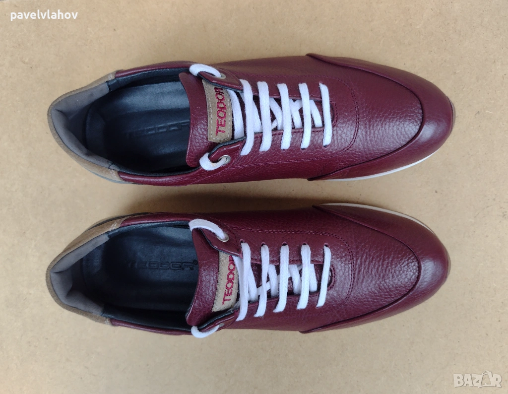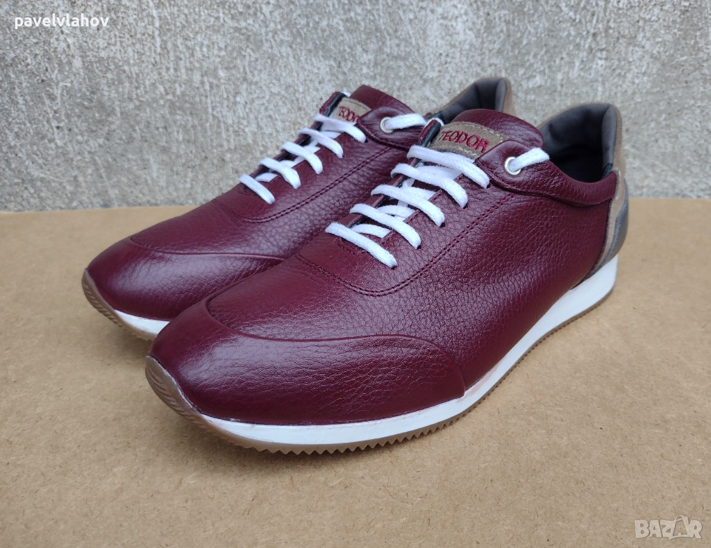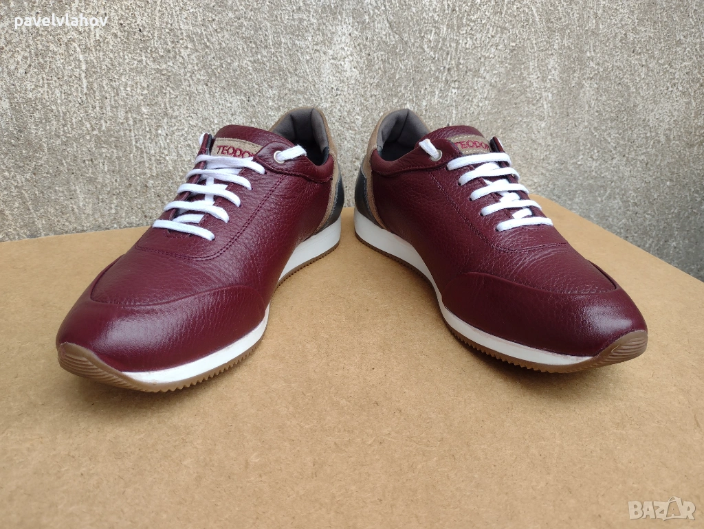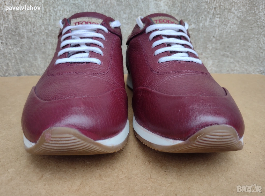 Кожени обувки тип “маратонки” на бранда TEODOR, в цвят бордо. Обувките са нови, обувани са веднъж с цел разтъпкване и то в помещение. Затова няма никакво съмнение дали са запазени, и дали са нови - вижда се с просто око от снимките. Който познава обувките на тази марка за дрехи, обувки и аксесоари, знае че имат добро, да не кажа и доста добро качество, защото съм носил не един или два модела на марката TEODOR. Подчертавам, че са 44 номер, защото производителят е разположил номер 43 на подметката - на една от снимките се вижда. Всеки бранд, който произвежда и продава обувки, има определен подход при изработката на моделите и размерите на обувките си, затова и стандартите за номерацията не съвпадат. Моите крака са за обувки 44 номер, но на тази марка съвпадат с техния 43 номер. Разгледайте снимките подробно, не случайно са снимани отблизо, с цел достатъчно добра информация. Специфични са като тип обувка, защото са нестандартен модел, с приятен дизайн и комфорт. Причината е проста поради, която ги продавам - не ги нося и стоят в кутията, защото имам други модели, с които краката ми са свикнали повече на тази марка. Иначе обувките са чудесни, но просто няма тенденция да ги обуя повече, затова ги и съхранявам съвестно за да са в състояние за продажба.