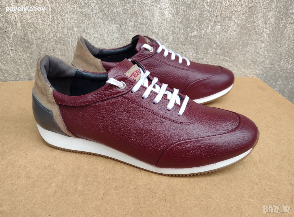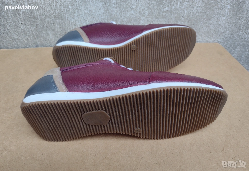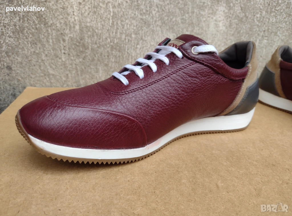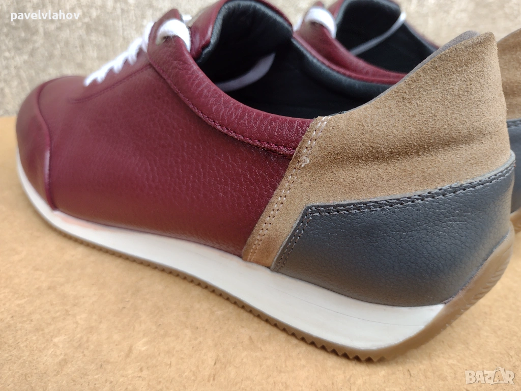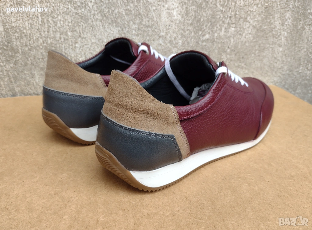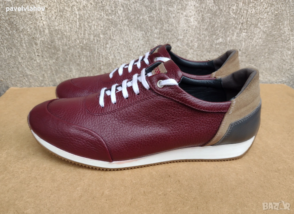 Кожени обувки тип “маратонки” на бранда TEODOR, в цвят бордо. Обувките са нови, обувани са веднъж с цел разтъпкване и то в помещение. Затова няма никакво съмнение дали са запазени, и дали са нови - вижда се с просто око от снимките. Който познава обувките на тази марка за дрехи, обувки и аксесоари, знае че имат добро, да не кажа и доста добро качество, защото съм носил не един или два модела на марката TEODOR. Подчертавам, че са 44 номер, защото производителят е разположил номер 43 на подметката - на една от снимките се вижда. Всеки бранд, който произвежда и продава обувки, има определен подход при изработката на моделите и размерите на обувките си, затова и стандартите за номерацията не съвпадат. Моите крака са за обувки 44 номер, но на тази марка съвпадат с техния 43 номер. Разгледайте снимките подробно, не случайно са снимани отблизо, с цел достатъчно добра информация. Специфични са като тип обувка, защото са нестандартен модел, с приятен дизайн и комфорт. Причината е проста поради, която ги продавам - не ги нося и стоят в кутията, защото имам други модели, с които краката ми са свикнали повече на тази марка. Иначе обувките са чудесни, но просто няма тенденция да ги обуя повече, затова ги и съхранявам съвестно за да са в състояние за продажба.