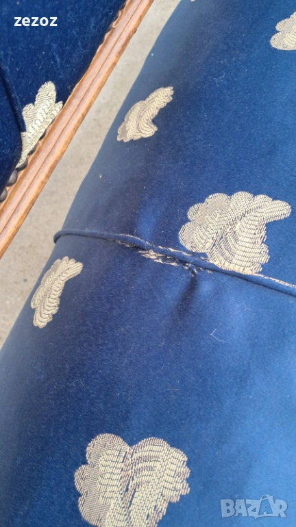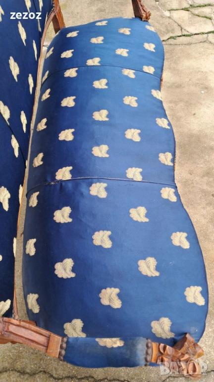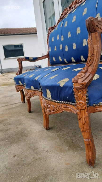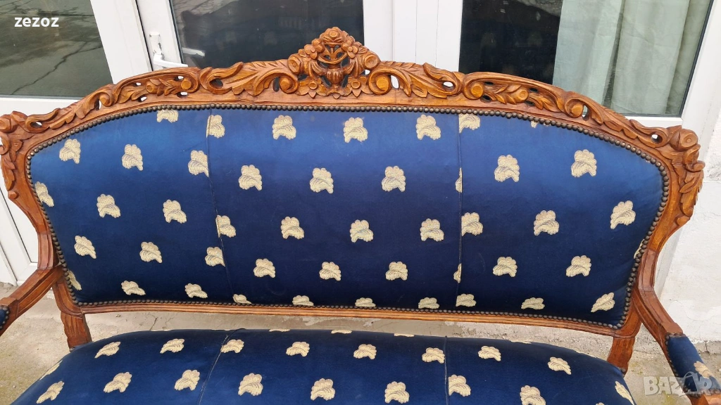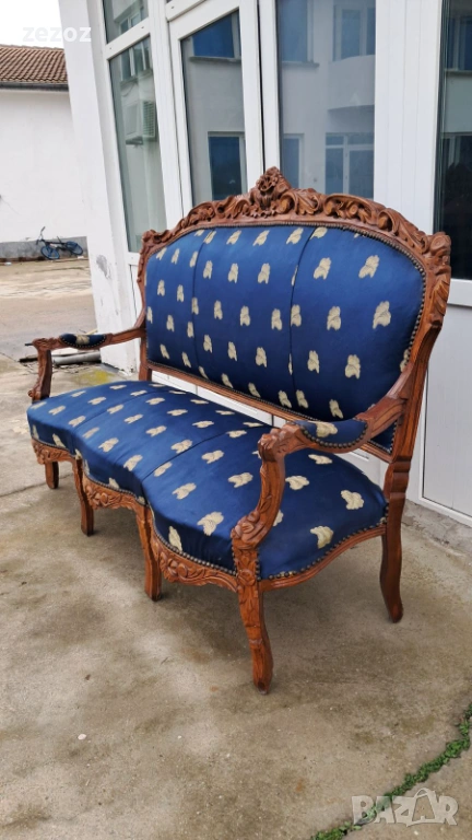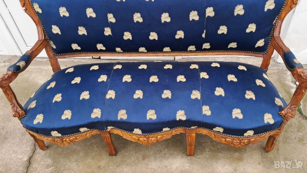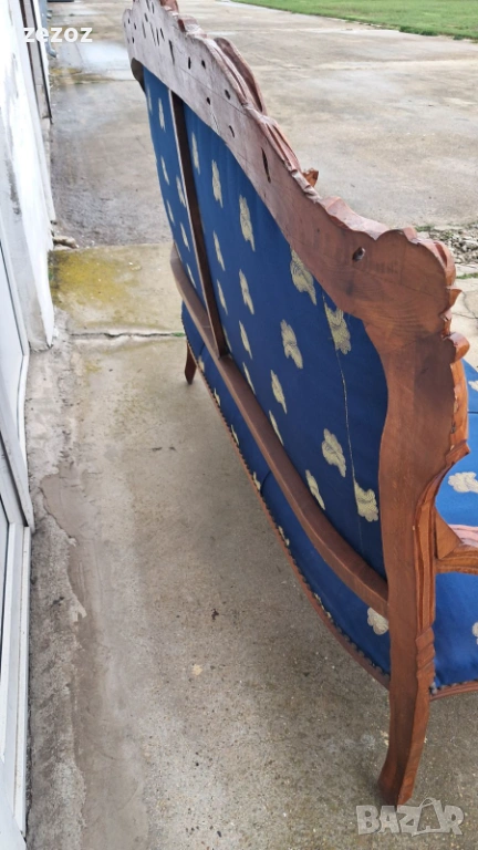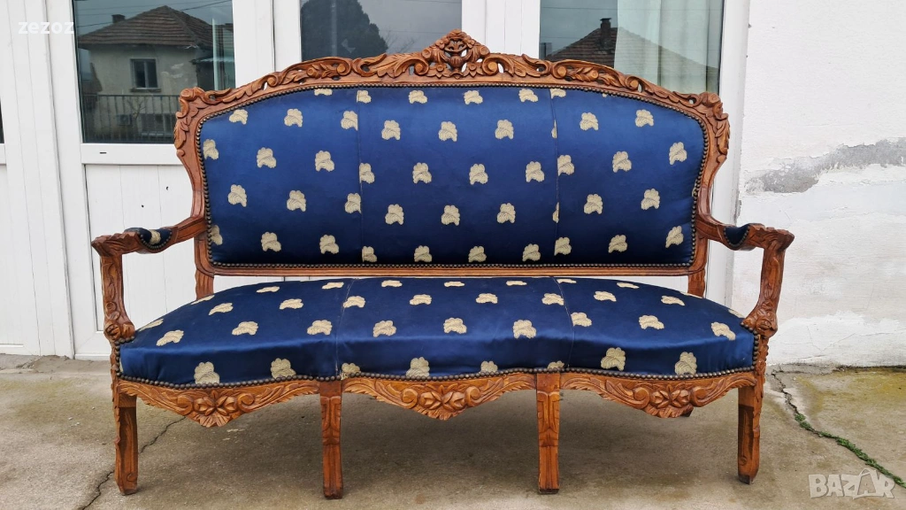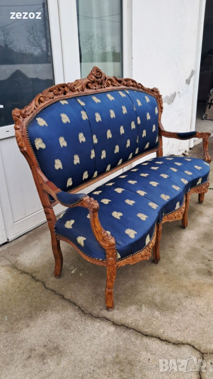Ретро диван,изработен от орехов масив в стил Луи 15.Ръчна дърворезба по корпуса,старата система на седалката-ремъци и пружини.Копринена дамаска в "кралско" синьо,запазена с минимални забележки.Дивана е стар и си има някави забележки,затова е необходимо да се огледа на място.Размери-