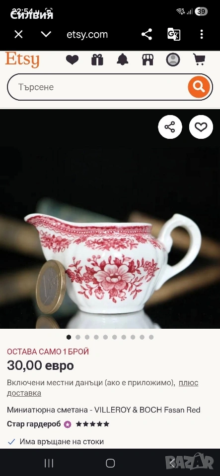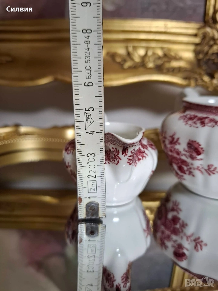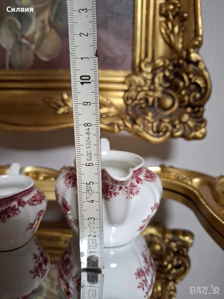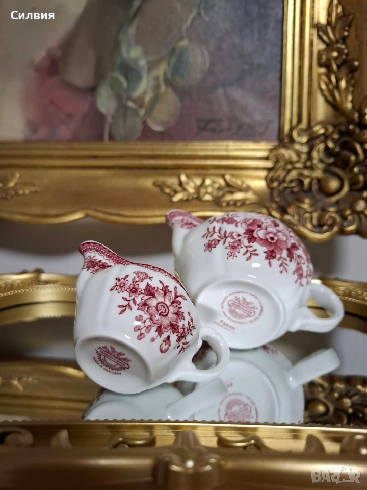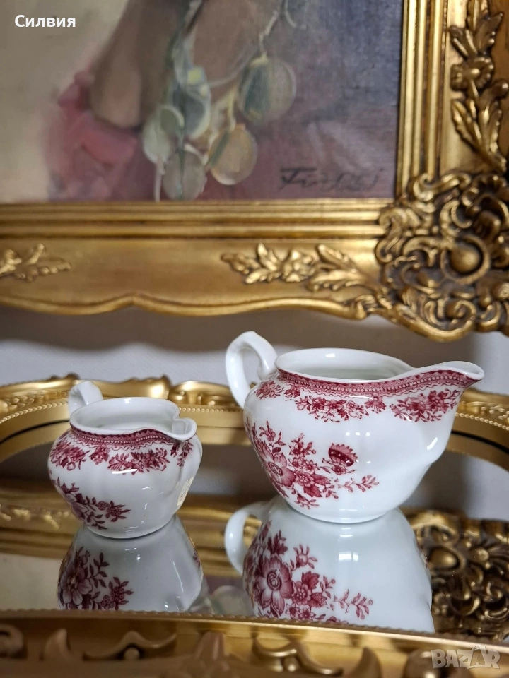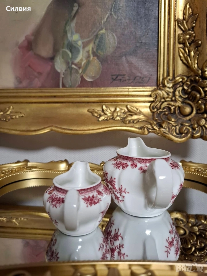 Две малки канички/латиери Vintage Villeroy & Boch Един изключително нежен и рядък комплект от две миниатюрни порцеланови канички на Villeroy & Boch. Те са част от легендарната серия Fasan, която е еталон за качество и детайл в продължение на десетилетия. Изящен дизайн: Каничките са украсени със сложни флорални мотиви в класическия за серията тъмночервен цвят (copperplate print). Релефни форми: Порцеланът притежава нежен релеф, който придава на съдовете допълнителна дълбочина и изтънченост. Маркировка: На дъното на всяка каничка е наличен оригиналният печат на Villeroy & Boch / Mettlach, гарантиращ автентичността и произхода им (Made in Germany). Състояние: Отлично запазени, без чипове или пукнатини – състояние, достойно за колекция. 🏛️ Атмосфера и приложение: Тези малки канички са перфектният акцент за Вашата витрина или интериор в антикварна атмосфера. Изглеждат зашеметяващо на огледална табла или подредени до тежък златист обков и маслени платна. Макар и малки по размер, те носят огромно визуално присъствие и духа на старата европейска аристокрация. Идеален избор за: Колекционери на марката Villeroy & Boch. Декорация на маси за следобеден чай в стил „Vintage“. Единствен по рода си подарък за човек с усет към детайла. Обща Цена 3️⃣5️⃣€ 《68,45лв 》🌹..•´¨) ¸.•¨) 🌱... (¸.•¨¯`*•.🍃🌹🍃