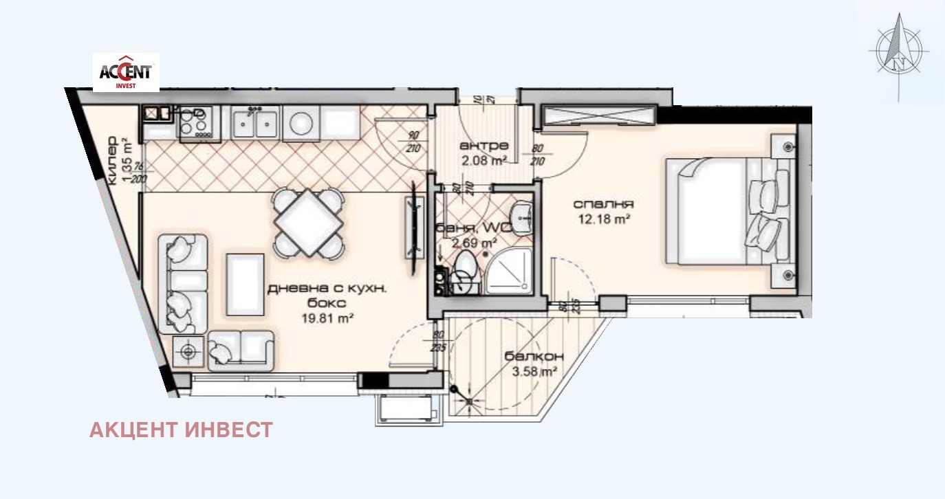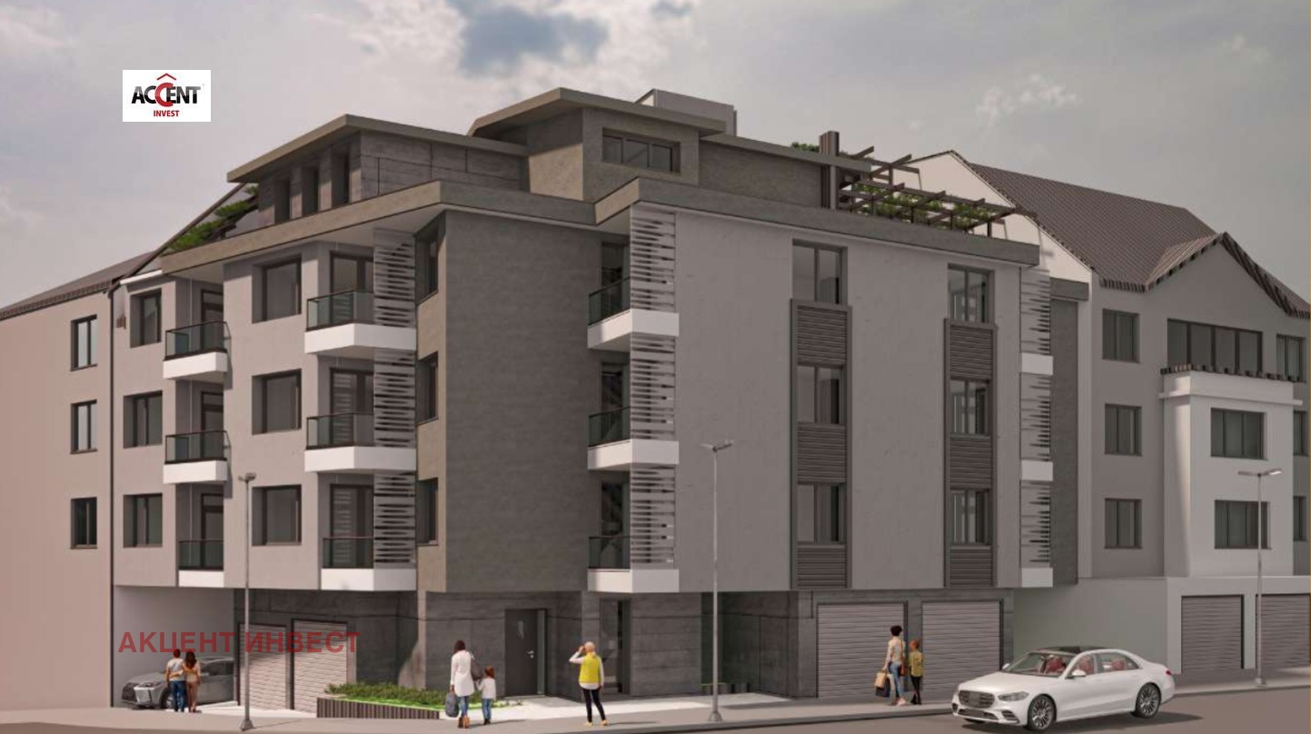 Акцент Инвест ви предлага Двустаен Апартамент с площ от 59,67 кв.м. находящ се в кокетна малка сграда на пет етажа, в която са ситуирани 16 апартамента, както и открити и подземни паркоместа и гаражи.