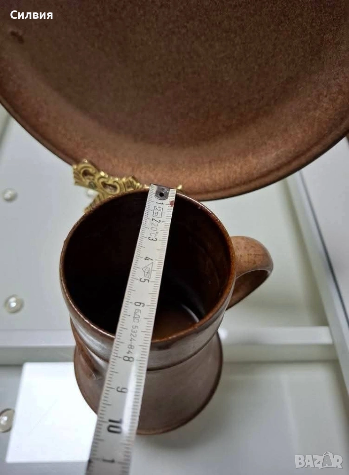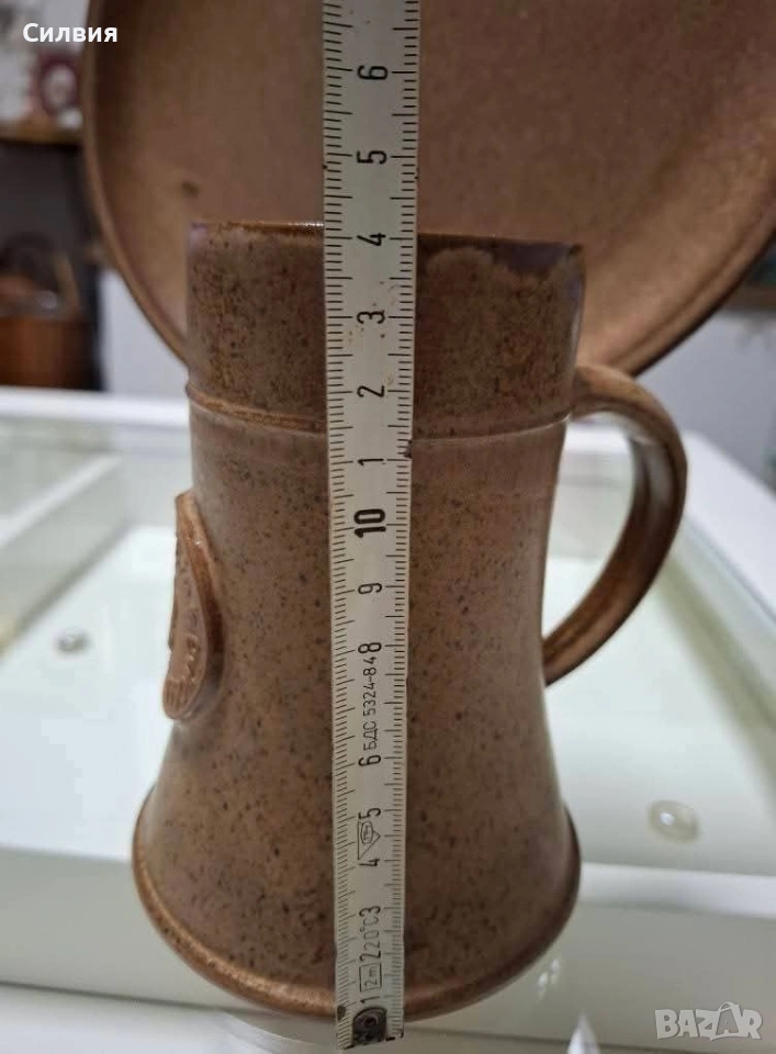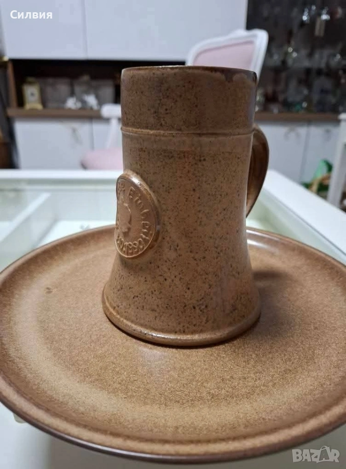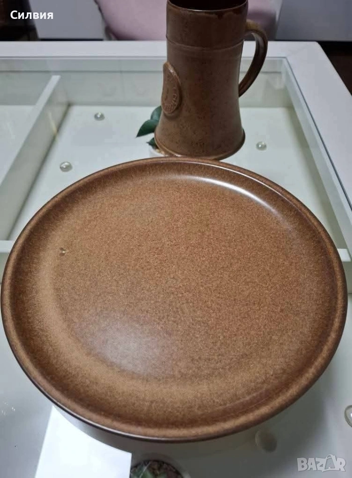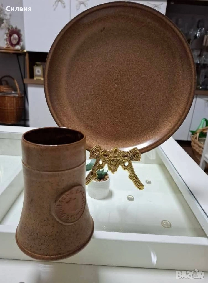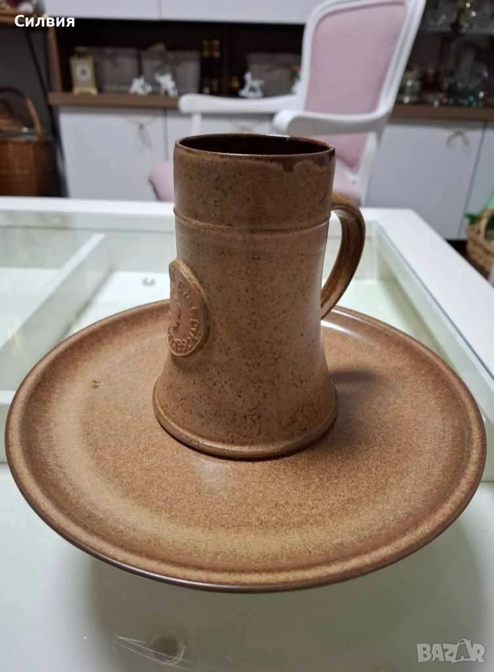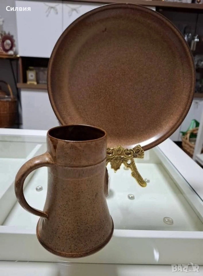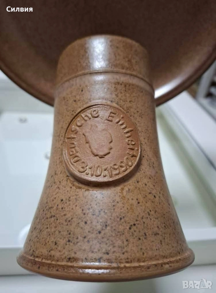 Комплект Керамична чиния/плато и Халба Този комплект не е просто винтидж керамика – той е автентичен исторически сувенир, посветен на ключово събитие в европейската история: Обединението на Германия на 3 октомври 1990 г. 🔍 Върху халбата е релефно гравиран кръгъл печат с текст "Deutsche Einheit 3.10.1990" (Германско Единство) и изображение на картата на обединена Германия. Това го прави подходящ артикул за колекционери. Изработени от плътна, качествена каменна керамика (stoneware) в топъл, рустикален кафяв цвят. Глазурата е тип "speckled" (с фини пръски), което придава дълбочина и естествен, рустикален чар. Състояние: Отлично запазени. 📏 Точни Размери: Диаметър на Чинията: ~ 26 см. Височина на Халбата: ~ 14 см. Вместимост 500мл. Диаметър на Горния Ръб 7см/Основата на Халбата: ~ 11 см. 🎁 Идеални за: Колекционери на исторически сувенири и мемориабилии. Любители на винтидж немската керамика (Steingut/Steinzeug). Цена 2️⃣5️⃣€ 《48,90лв》 •✽✧✽•°”˜🦋”°•✽✧✽•°”˜🦋”°•✽✧✽•°”˜🦋”°•✽✧✽•°”🦋˜”°•✽✧✽•