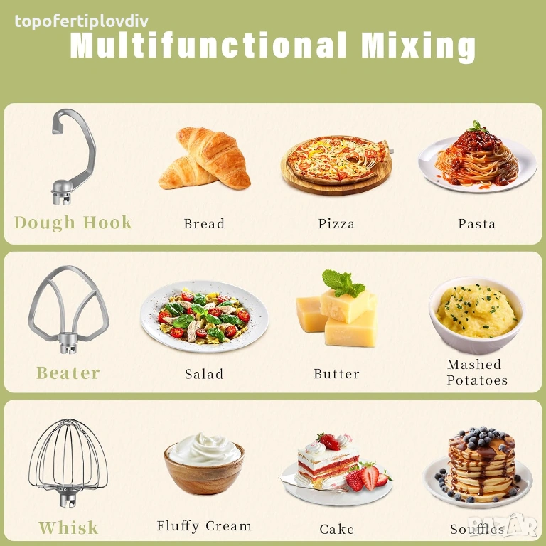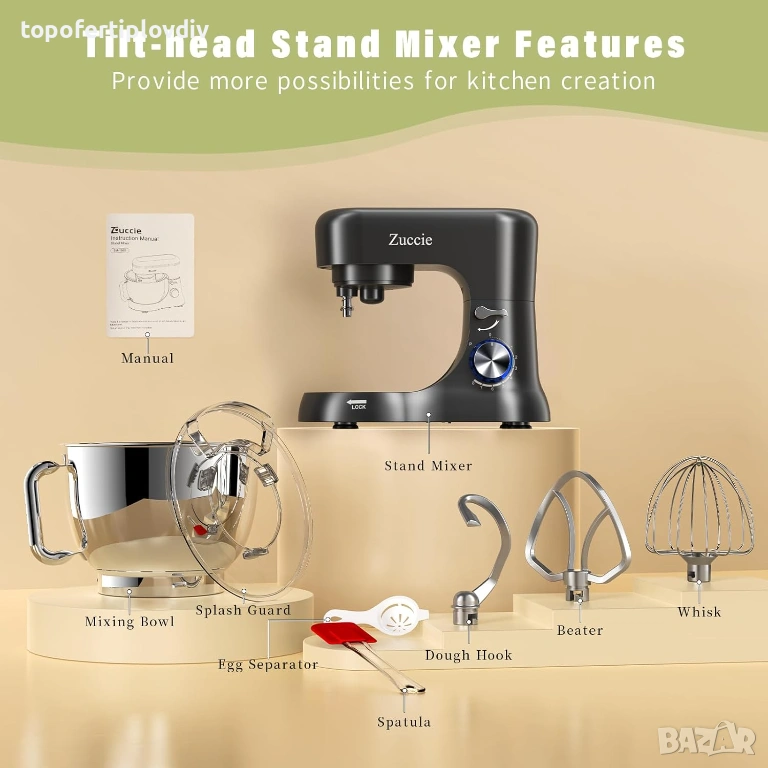 Голям капацитет: Тенджера от неръждаема стомана 5.5QT с голям капацитет може да отговори на нуждите на 2-5 души в семейство. Стационарните миксери с накланяща се глава могат да месят тесто, да смесват салата или месо и да разбиват белтъци. Хляб, пица, паста, сладолед или торти могат лесно да се приготвят.