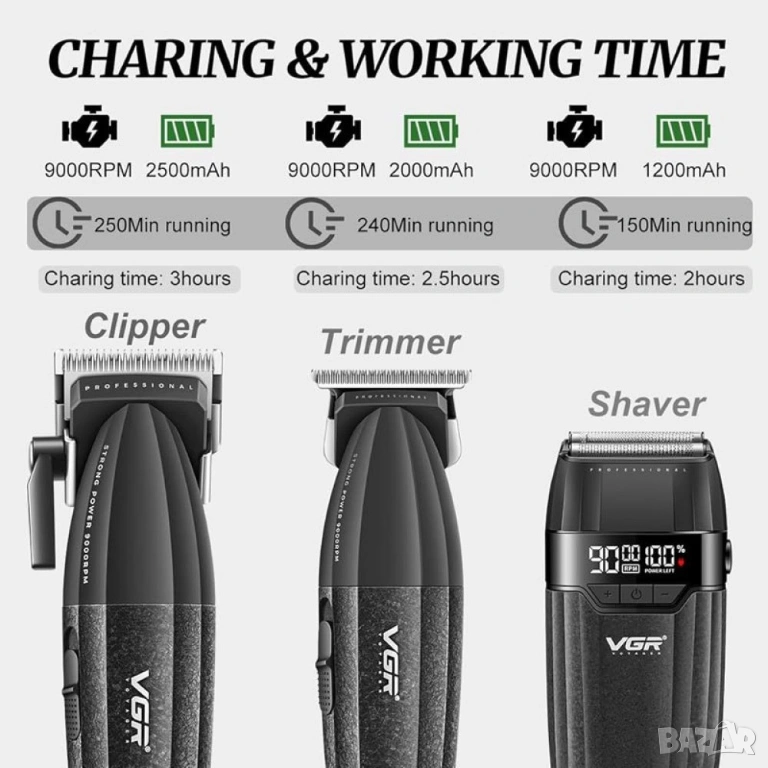 VGR 640S3 е цялостен професионален комплект за подстригване и бръснене, създаден както за барбъри, така и за домашна употреба. Включва машинка за подстригване, прецизен тример и електрическа самобръсначка с фолио – всичко необходимо за пълна грижа в един комплект.