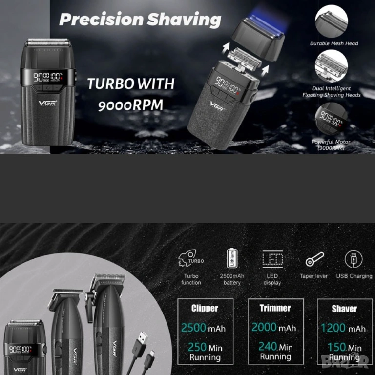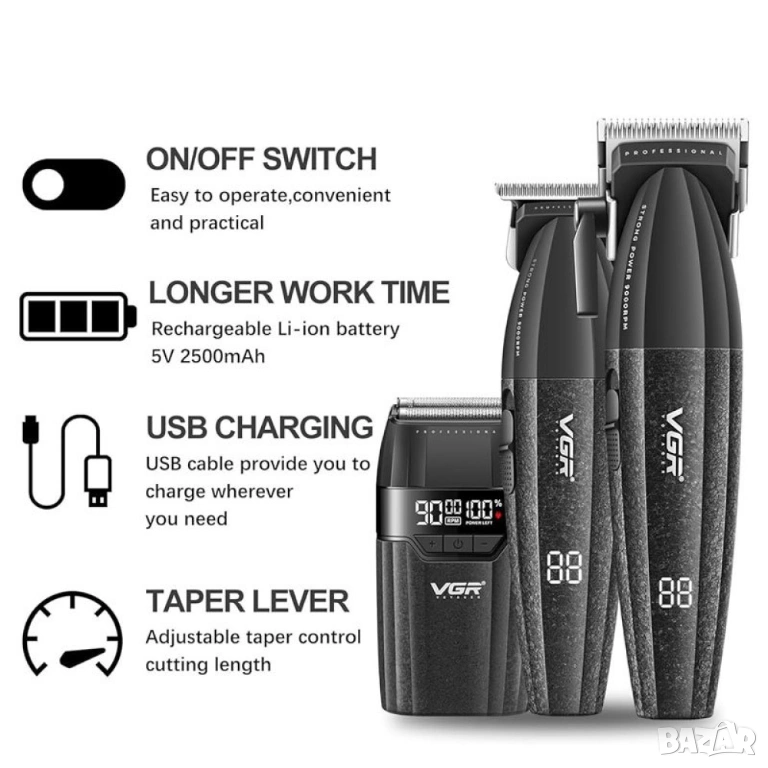 Професионален комплект VGR 640S3 – 3 в 1 (Черен) машинка за подстригване, тример и фолио самобръснач