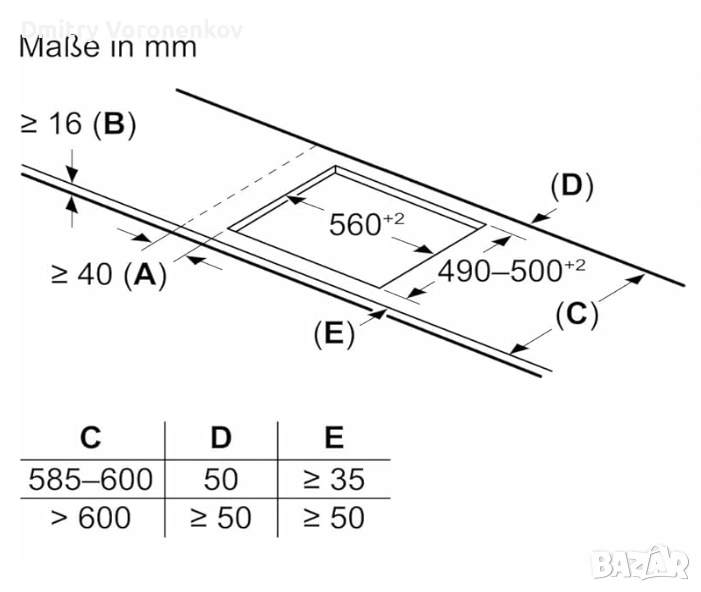 Размери за вграждане (изрез в плота): 560 x 490 мм