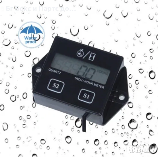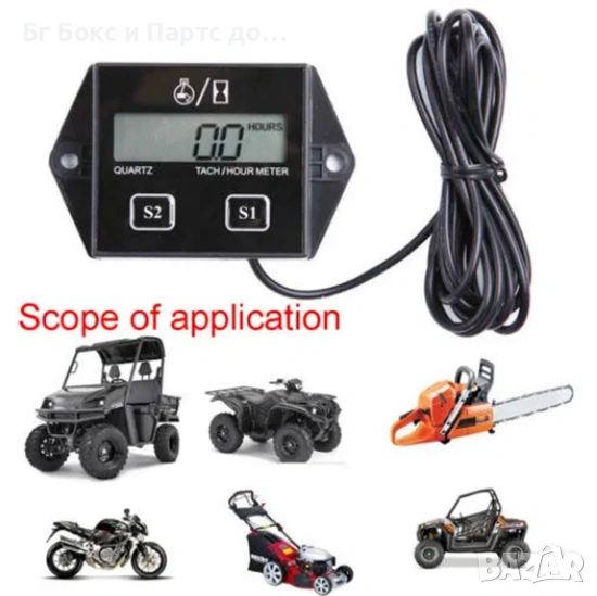 Брояч на мото-часове и оборотомер за двигатели с вътрешно горене. Става за всички 4-тактови и 2-тактови бензинови двигатели, ATV-та, кросови мотори, лодки , скутери , култиватори , косачки и т.н. Тахометърът служи за следене продължителността на работата и оборотите на вашия двигател, за следене при смяна на масла, филтри настройки на клапани и др. Не се свързва към ел. инсталацията просто се правят няколко навивки около високоволтовия кабел за свещта. Настройка на интервал за обслужване на двигателя. Възможност за нулиране на данните. Влагозащитен. Вградена Li-ion батерия.