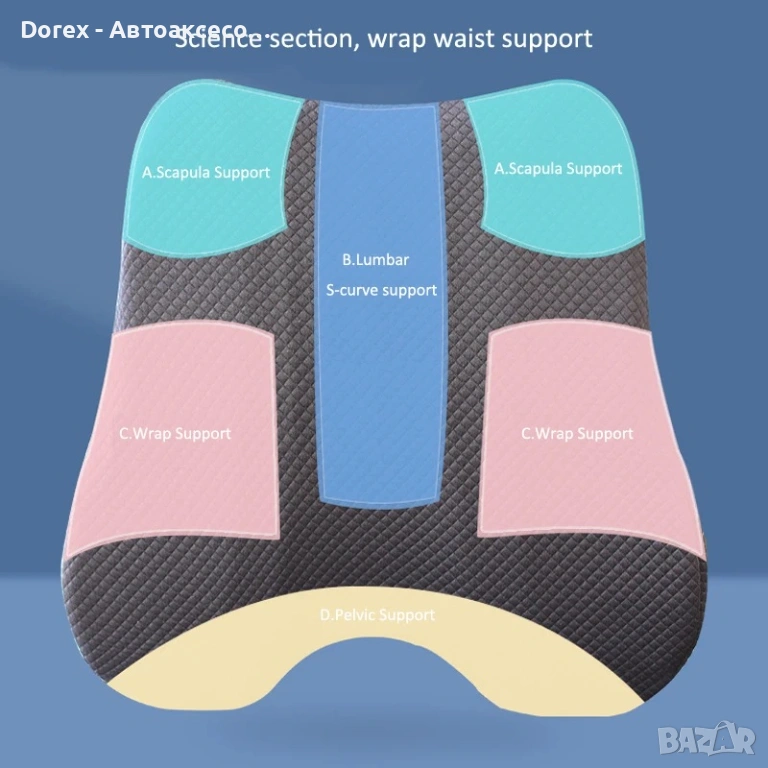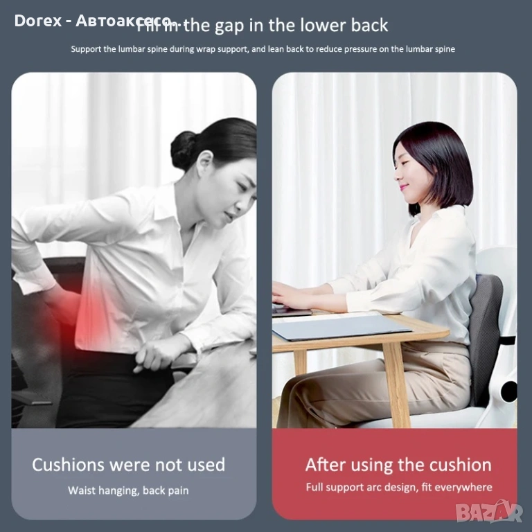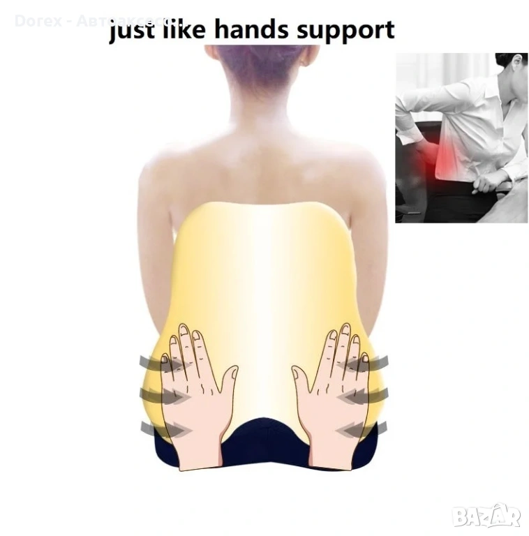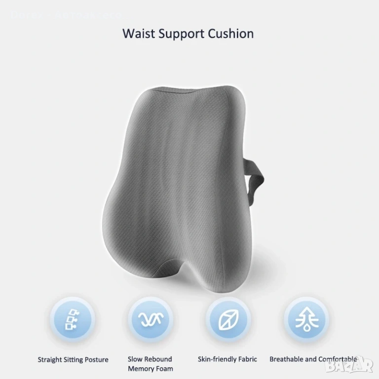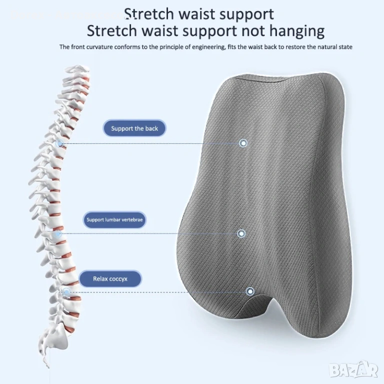 Поддържа естествената форма на гръбначния стълб и подобрява стойката при седене. Универсална възглавница за офис стол, домашен стол или автомобилна седалка. Идеална за хора, които прекарват дълго време в седнало положение, като осигурява комфорт и облекчение на кръста.