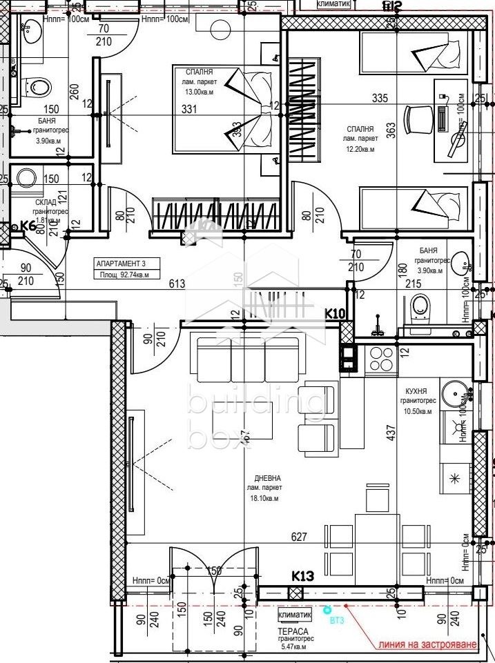 - РАЗПРЕДЕЛЕНИЕ: Апартаментът се състои от всекидневна с кухненски бокс, с площ от 28,60 кв.м, две непреходни спални по 12,20 кв.м и 16,90 кв.м, две бани с тоалетни, като едната е към родителската спалня, склад и тераса.