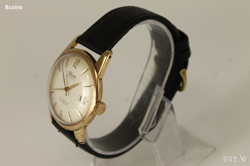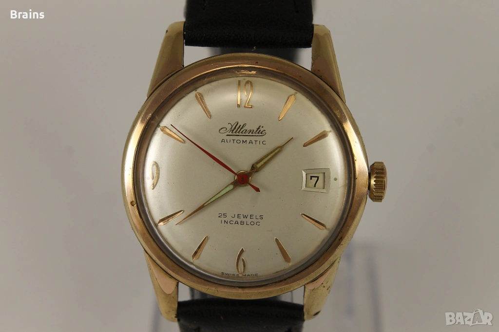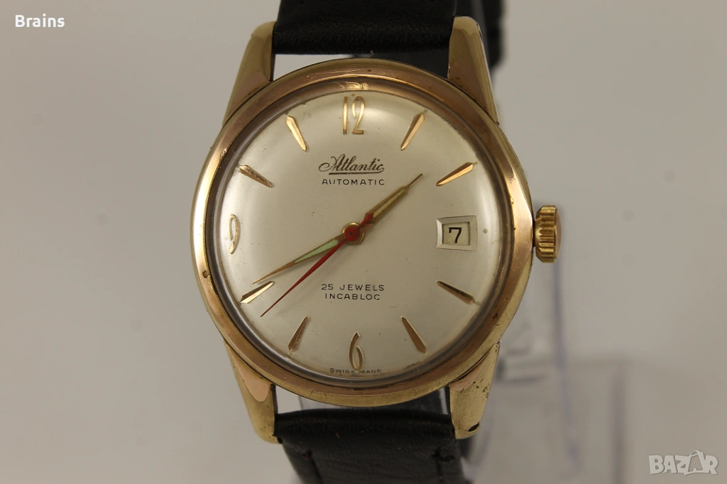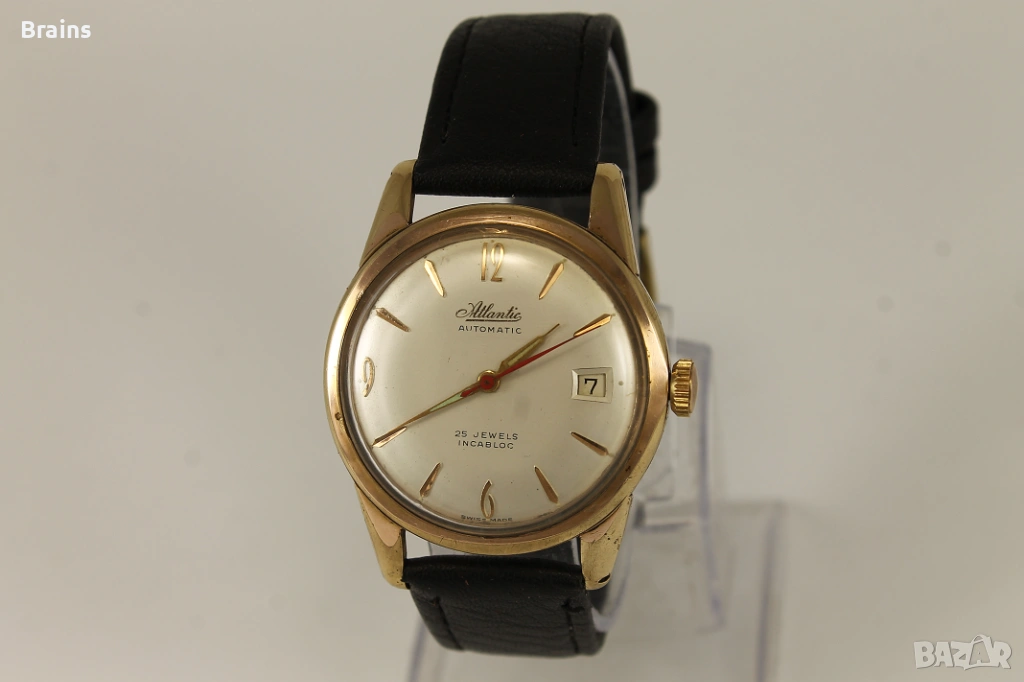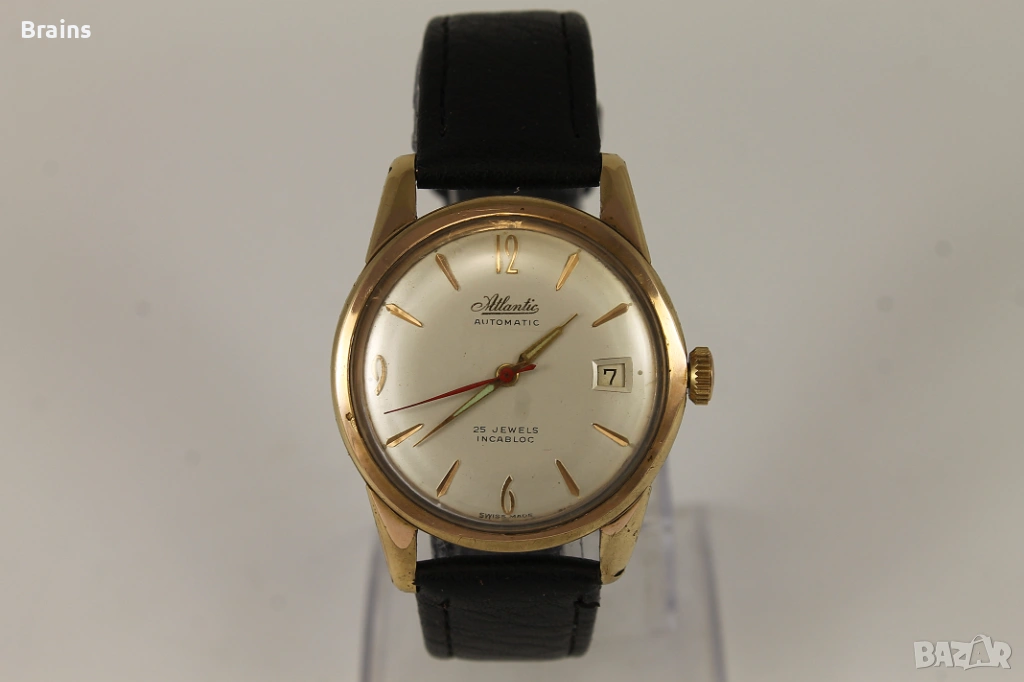 Рядък мъжки позлатен Швейцарски ръчен часовник ATLANTIC Automatic от 1950-те години. Отличен циферблат и стрелки. Калибър AS 1700 Automatic със 25 камъка, 3-позиционно калибриран. Машината е с розова позлата и без никакви визуални забележки, работи перфектно, автомата навива, календара работи. Стоманена задна капачка.