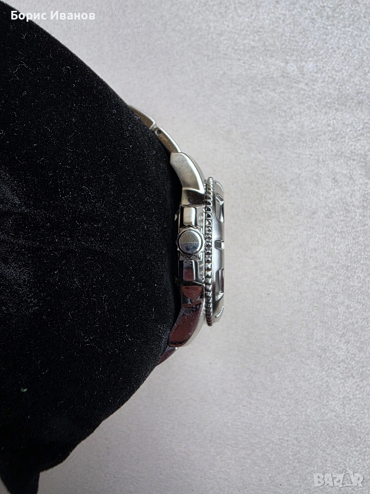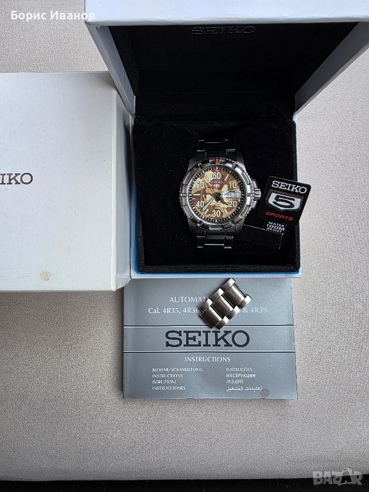 Производство за Азия, изчерпан модел. Спецификации: Произведено в Япония Корпус и гривна от неръждаема стомана Автоматично движение Калибър 4R36 24 бижута Хардлекс кристал Кафяв камуфлажен циферблат Светещи стрелки и маркери Показване на ден и дата Прозрачен заден капак Закопчалка за разгръщане 100M водоустойчивост Размери 43мм корпус без коронка дебелина 13 мм Рядък отдавна изчерпан модел с Miltary насоченост, пълен комплет състоянието е видно от снимките.Цена 200€ като предпочитам лично предаване за град София.