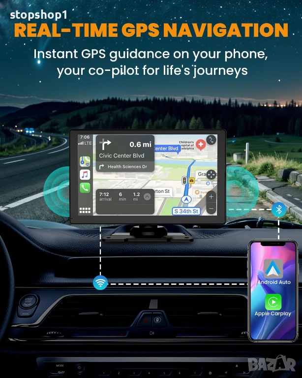 - Синхронизиране на навигацията в реално време: Тази Android CarPlay може безпроблемно да синхронизира GPS приложението на вашия смартфон (Google Maps, Apple Maps, Waze и др.) в реално време, предоставяйки ви актуализирани карти и по-ясни упътвания на по-голям екран с резолюция 1024x600. Тъй като екранът на Apple Play предлага по-широк изглед от този на телефона ви, ще се насладите на превъзходна яснота и прецизност по време на шофиране, което намалява напрежението в очите и улеснява следенето на навигацията. (Забележка: Тази CarPlay не включва вградени GPS карти. Навигационните данни се синхронизират директно от телефона ви.)