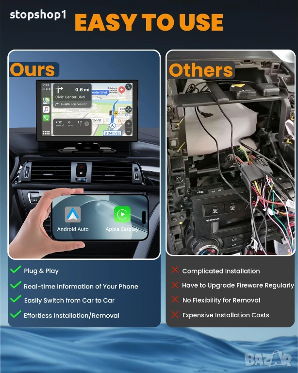 - Лесен монтаж и демонтаж: За разлика от традиционните системи за автомобилно забавление, нашият безжичен Apple CarPlay предлага бърз и лесен монтаж, който можете да направите сами – без сложно окабеляване или професионална помощ, което ви спестява време и пари. Неговият опростен дизайн „plug-and-play“ позволява лесно демонтиране и прехвърляне между различни превозни средства, което го прави идеален за собственици на множество автомобили или за тези, които често сменят превозни средства. Насладете се на безпроблемна функционалност на безжичния CarPlay екран във всеки автомобил, по всяко време, без допълнителни разходи или сложност.
