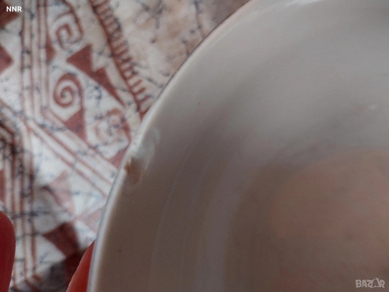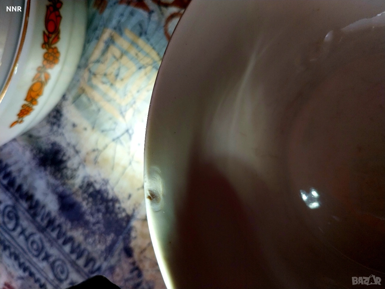 На ръба на едната има чукнато - вижте снимките.
