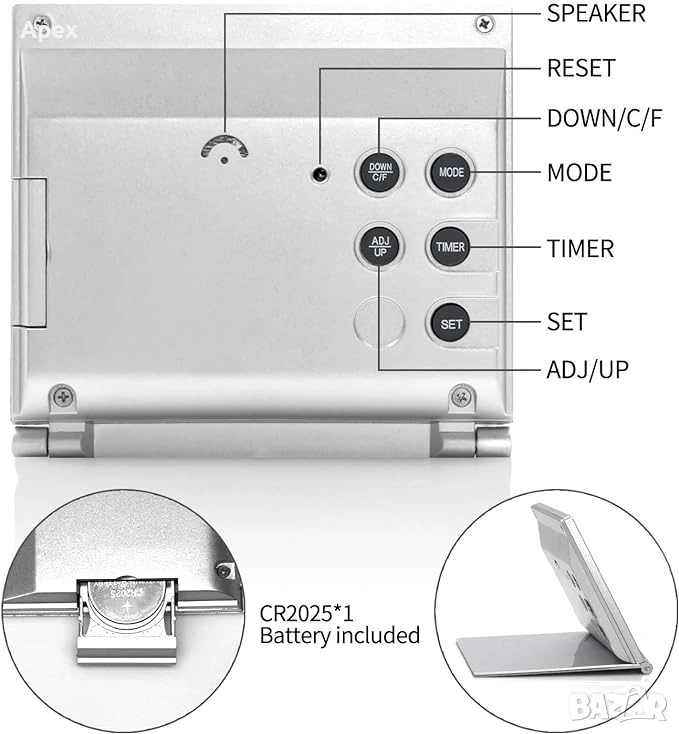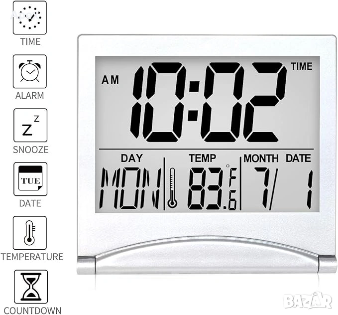 *Функции:Вечен календар,Термометър (C/F),Хронометър,Таймер,Аларма с дрямка.