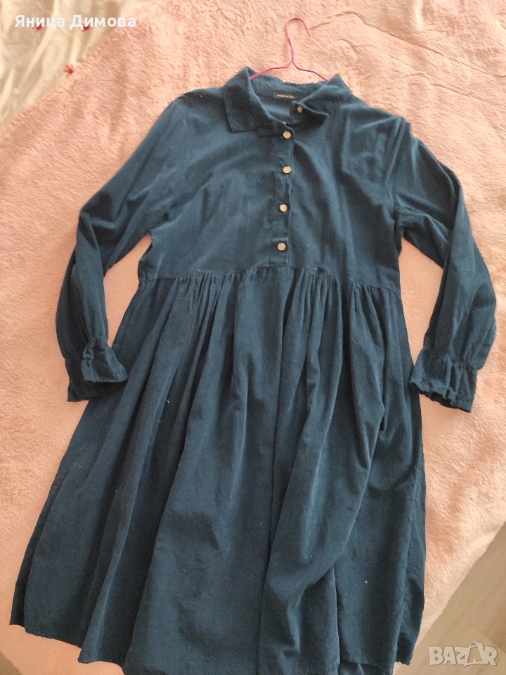 Тъмно синя джинсена рокля с дълъг ръкав.