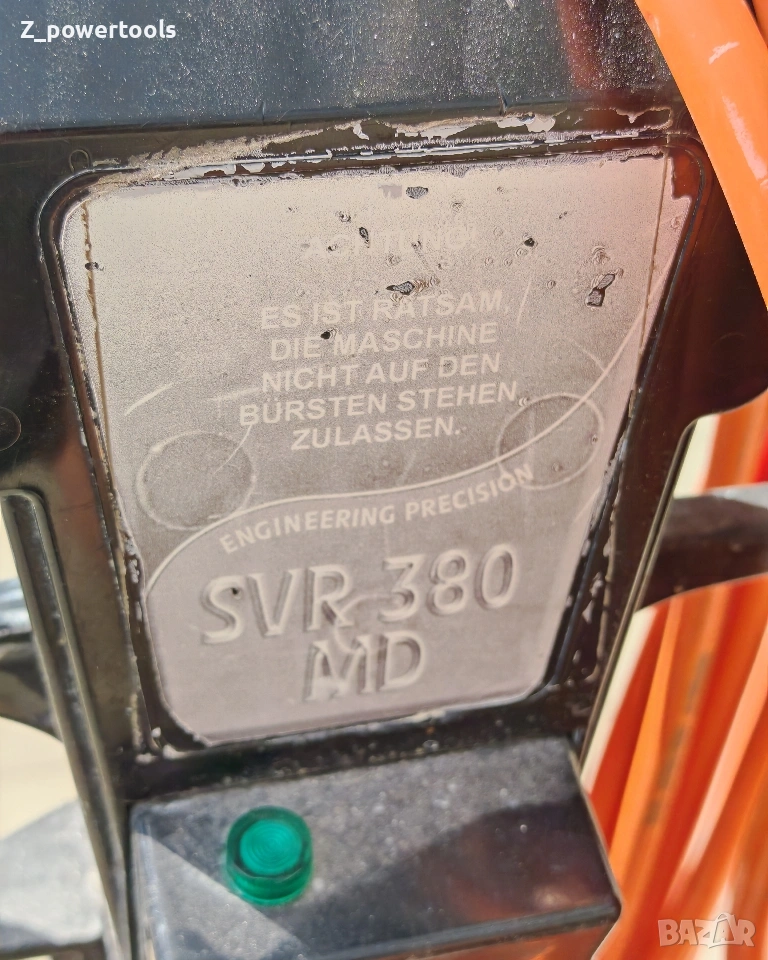 еднодискова подопочистваща машина, модел SVR 380 MD. Машината е изключително здрава, немско производство (Engineering Precision), проектирана за тежка работа и висока натоварваемост. Подходяща е за основно почистване, полиране, шлайфане на твърди подови настилки (бетон, мозайка, камък) и пране на килими.
