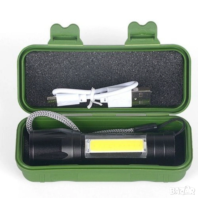 LED Джобен фенер с 3 режима, презареждаем, с USB кабел в зелена кутия FL45.