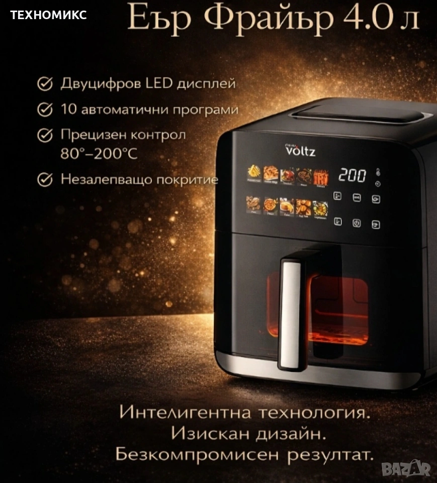 Фритюрник Air Fryer Oliver Voltz OV51980CE, 1200W, кошница 4 л., LED дисплей, 10 предварително зададени програми, Таймер