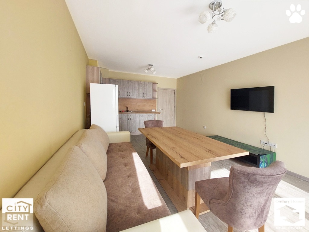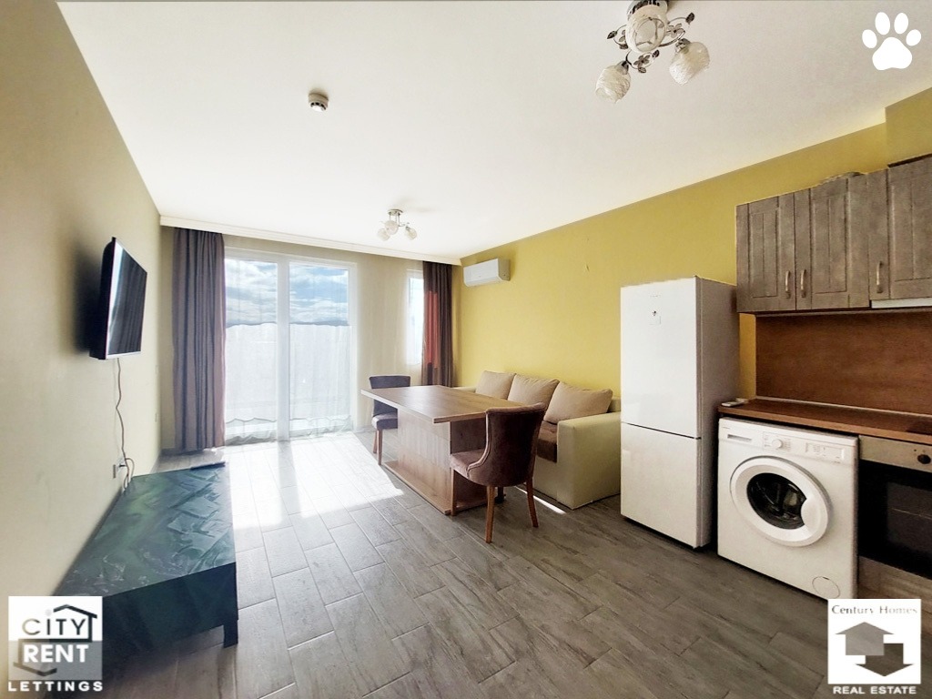 Мебелировката и оборудването са нови. Жилището разполага с вградена фурна, стъклокерамични котлони, абсорбатор, хладилник, пералня и телевизор, а отоплението е на ток, с климатици. Удобен диван с кухненска маса, столове, тв секция и стилно обзаведена кухня, допълват уютната атмосфера в жилището.