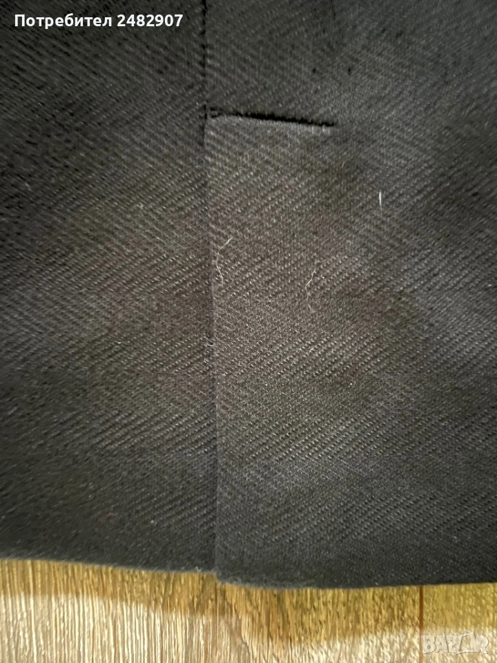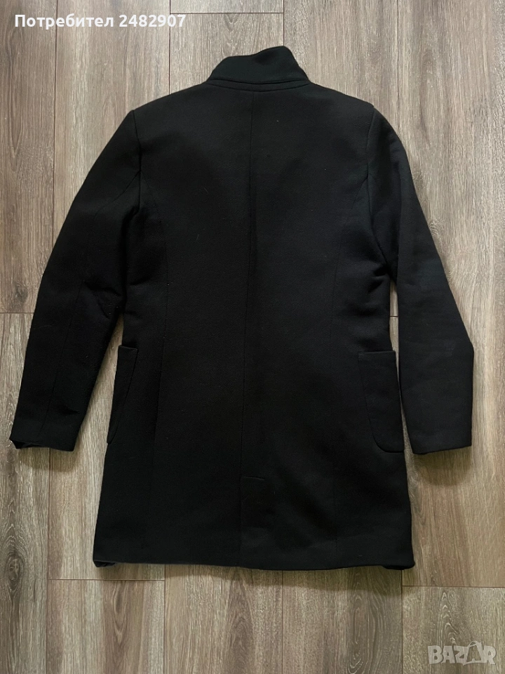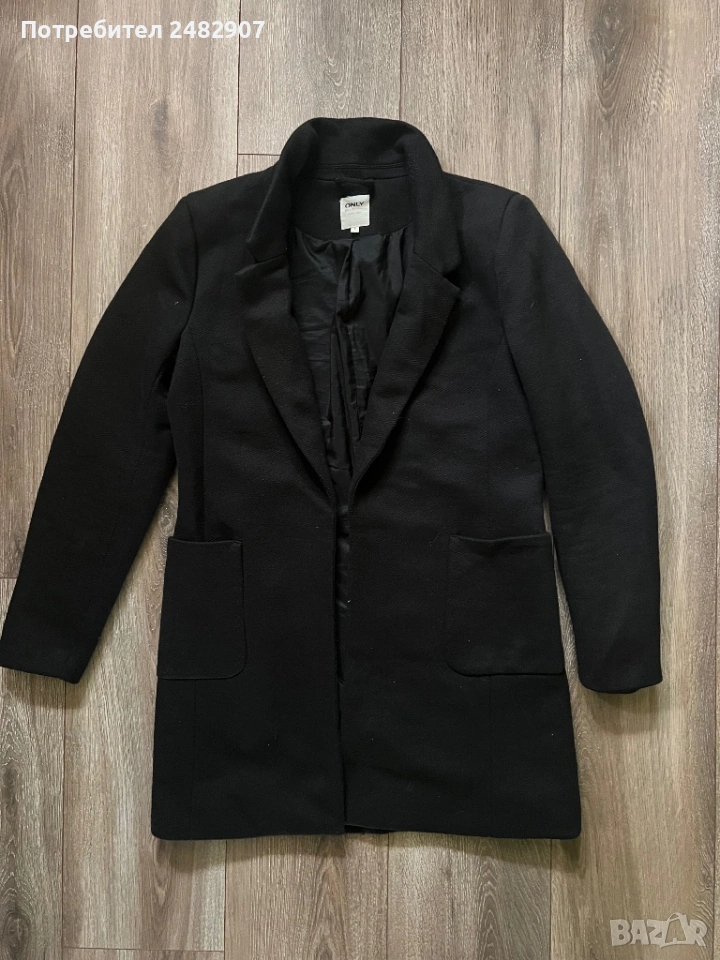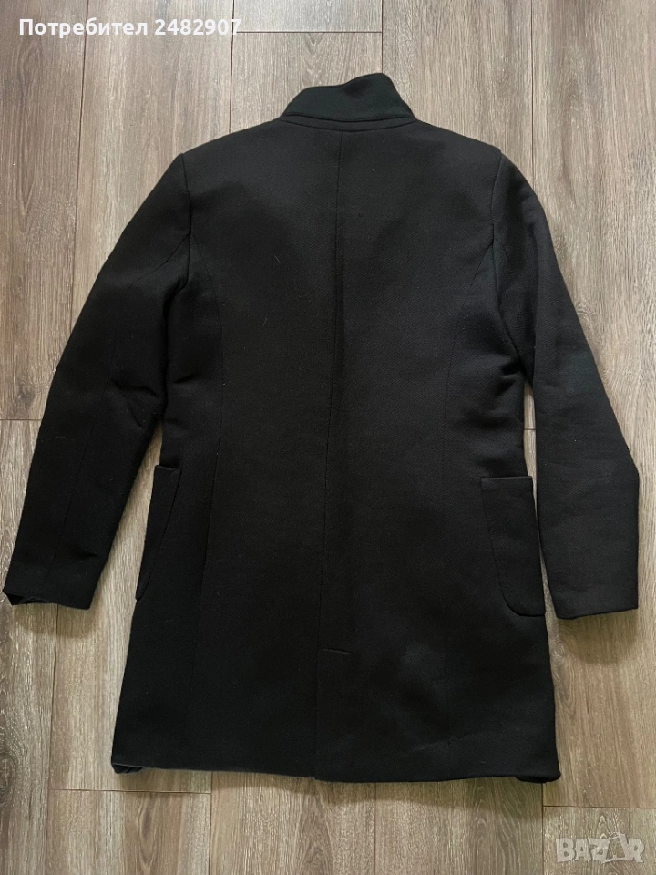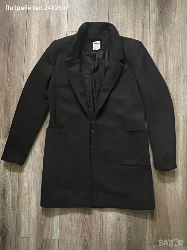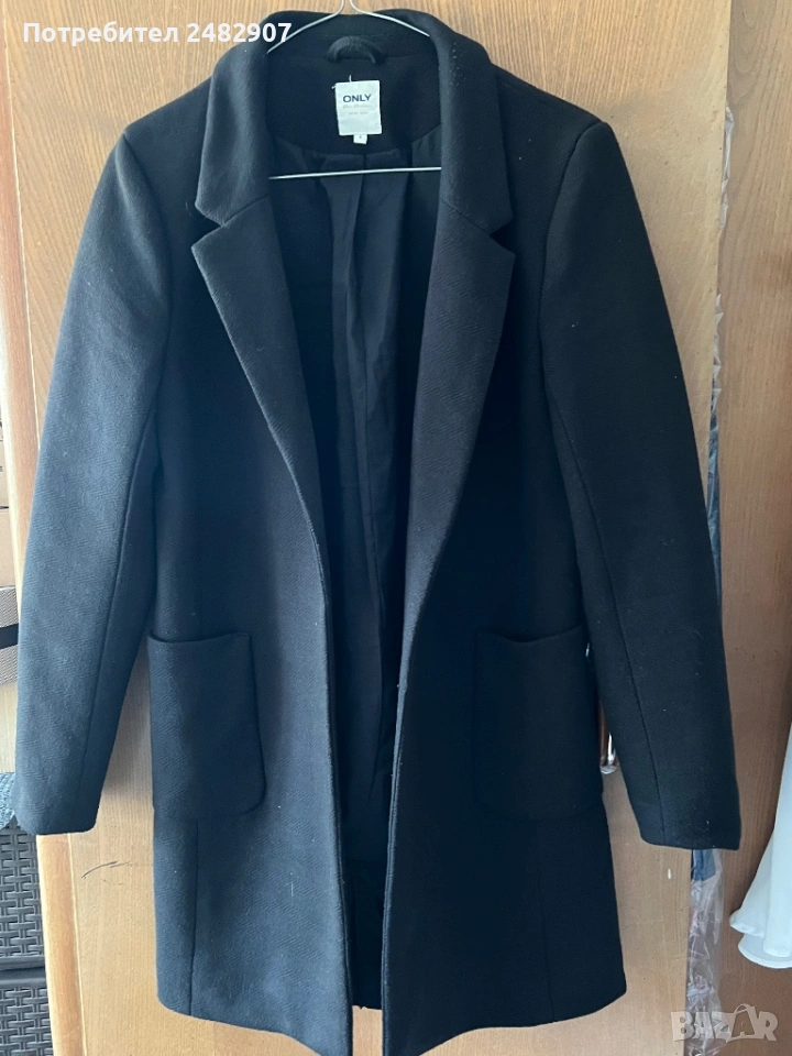 Черно дамско палто с подплата, размер S. Съдържа 65 % полиестер и 35 % памук. Ширина в раменете - 40 см, ширина под мишниците - 49 см, ширина в долната част - 53 см, дължина от рамото до долу - 70 см, дължина на ръкава от рамото - 60 см, ширина на ръкава в долната част - 11 см. Много запазено, почти не е използвано, с два джоба, без копчета.