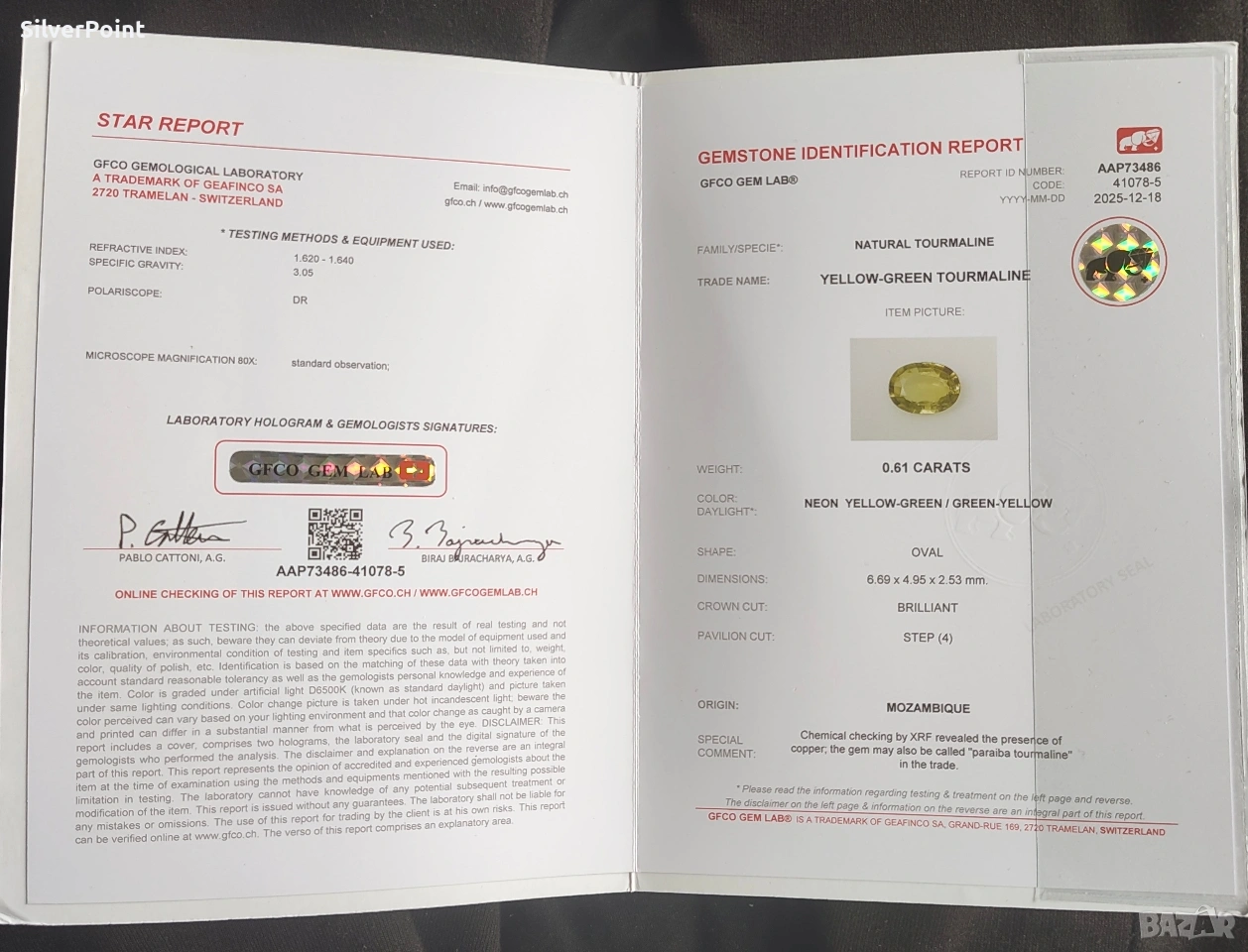 Турмалин Параиба VVS с швейцарски сертификат → Обява 54080579
