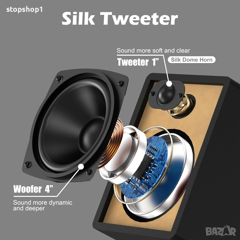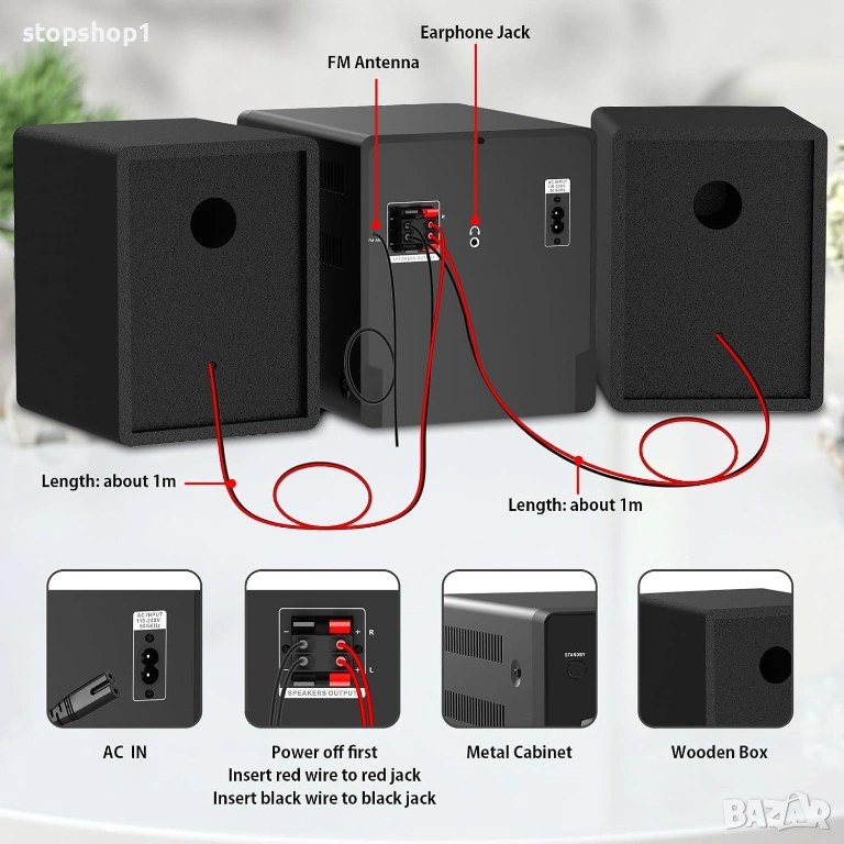 Състои се от 3 части: 1 основно устройство + 2 високоговорителя, които лесно се свързват с кабели. Размери на продукта: основно устройство 6,3*8,5*7 инча/16*21,5*18 см / високоговорител (единичен) 5,2*7,2*6,3 инча/13,3*18,4 x*16 см. Тегло на продукта: 8,5 паунда/3,9 кг.