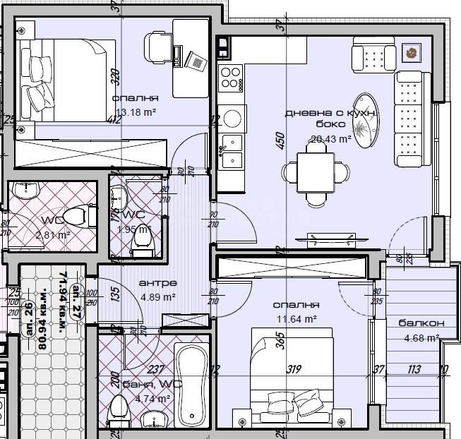 Апартаментите в сградата се продават в степен на завършеност по БДС. Жилищата са с правилни форми, без излишни чупки и скосени пространства. Има възможност за обединяване и завършване до ключ. Предлагат се апартаменти с една и две спални.
