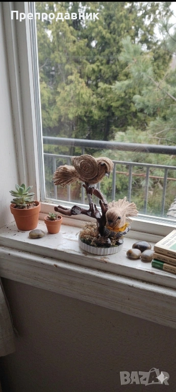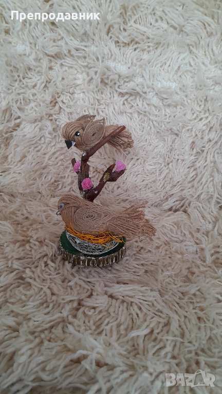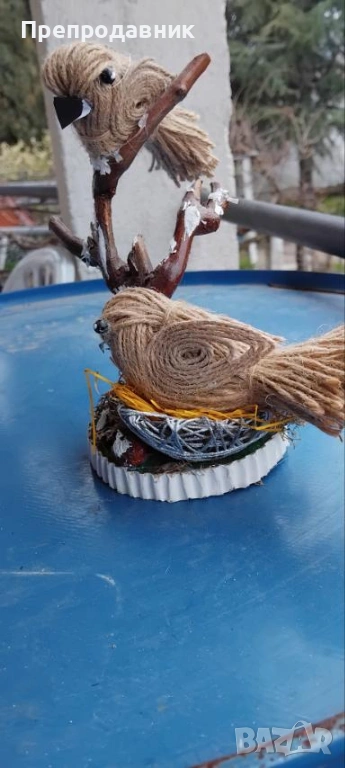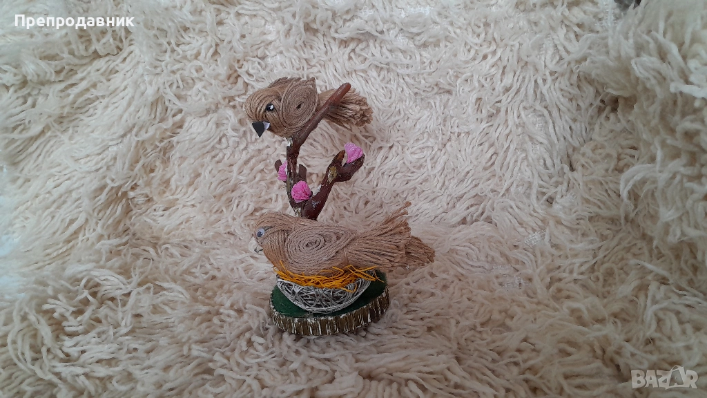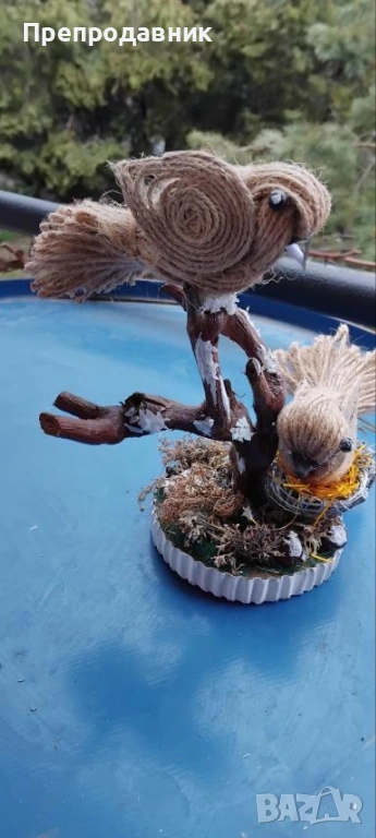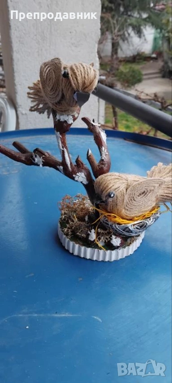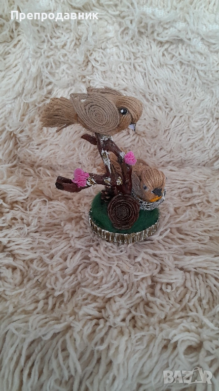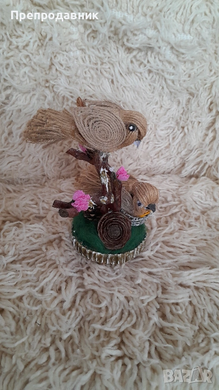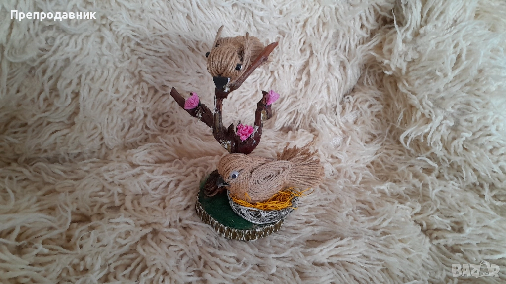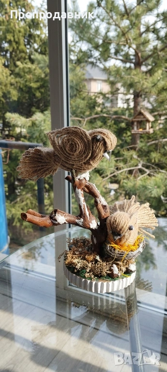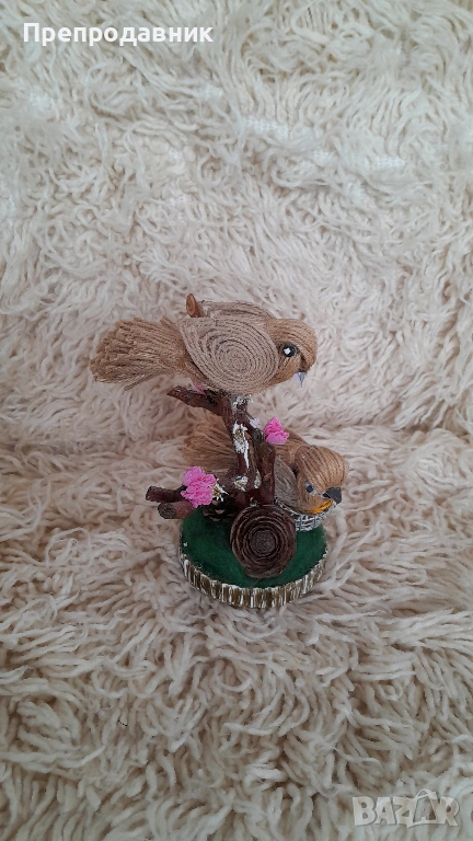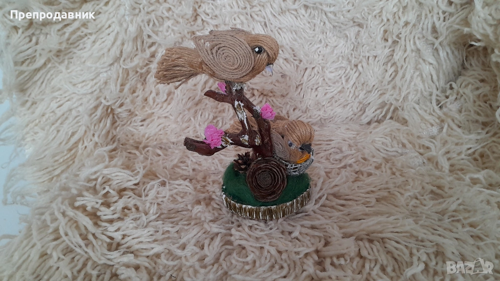 Дизайн: Две симпатични пиленца, кацнали върху клонче, разположени върху стабилна основа с „тревичка“.