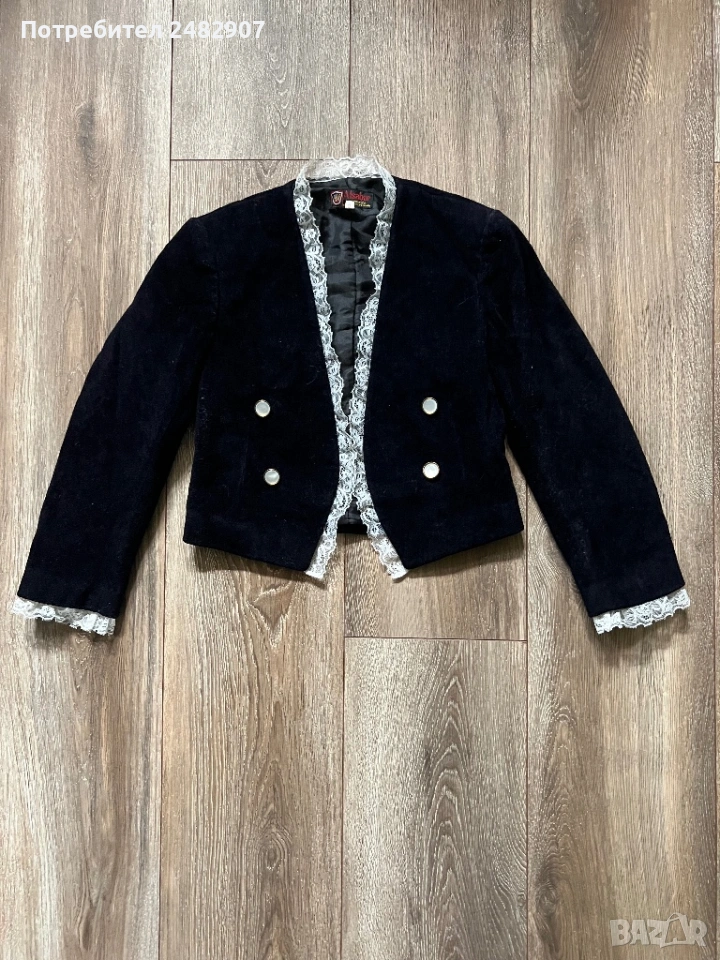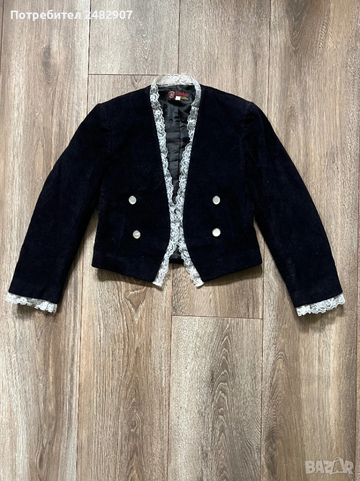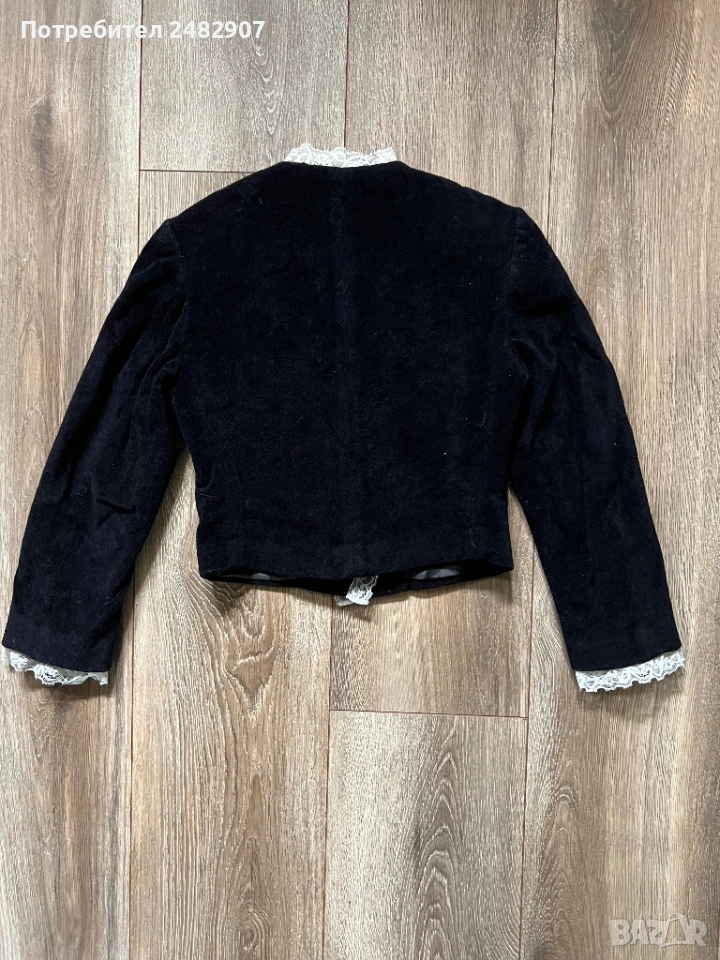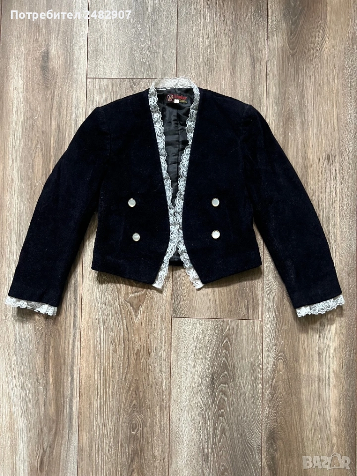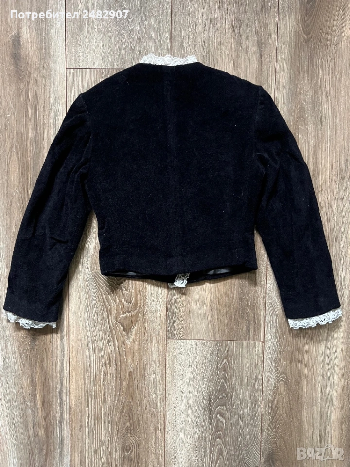 Черно кадифено детско сако с подплата и дантела за възраст - 7-8 години. Съдържа 100 % полиестер. Ширина в раменете - 31 см, ширина под мишниците - 35 см, ширина в долната част - 34 см, дължина от рамото до долу - 41 см, дължина на ръкава от рамото - 46 см, ширина на ръкава в долната част - 11 см. Много запазено, почти не е използвано, не се закопчава. Подходящо е за връхна дреха към народна носия.