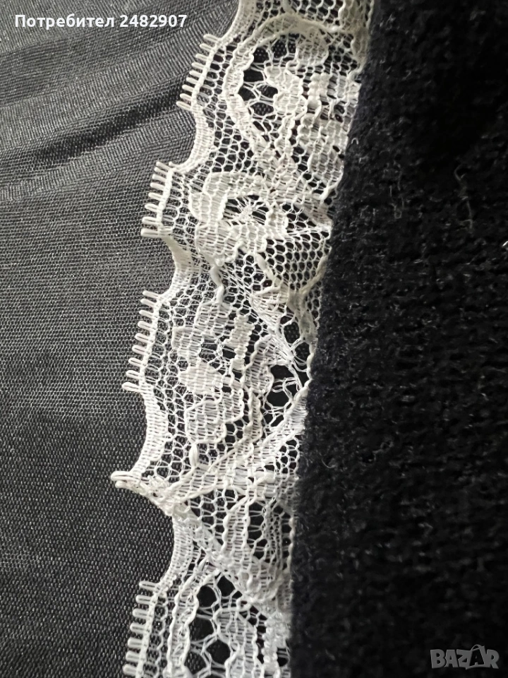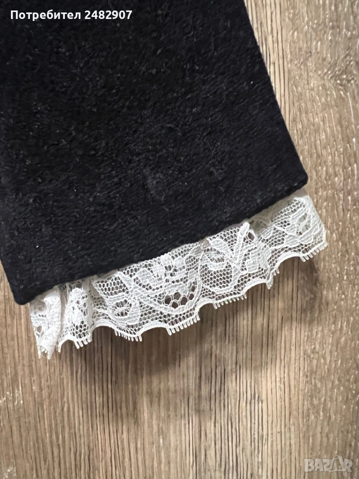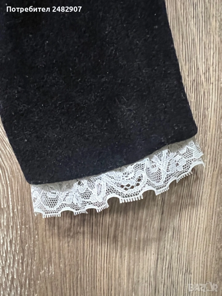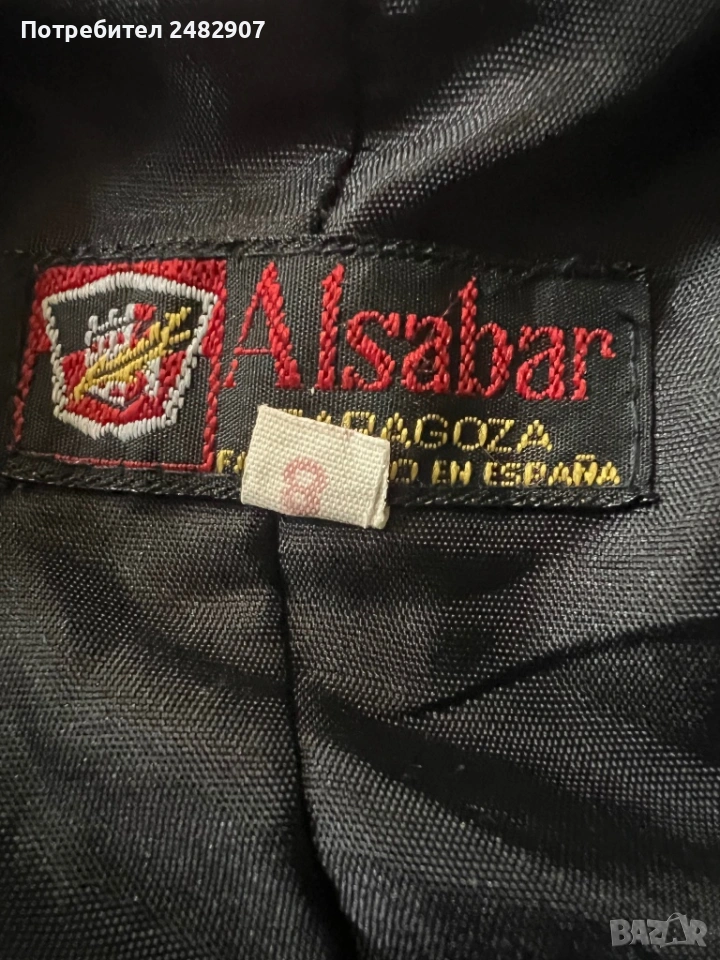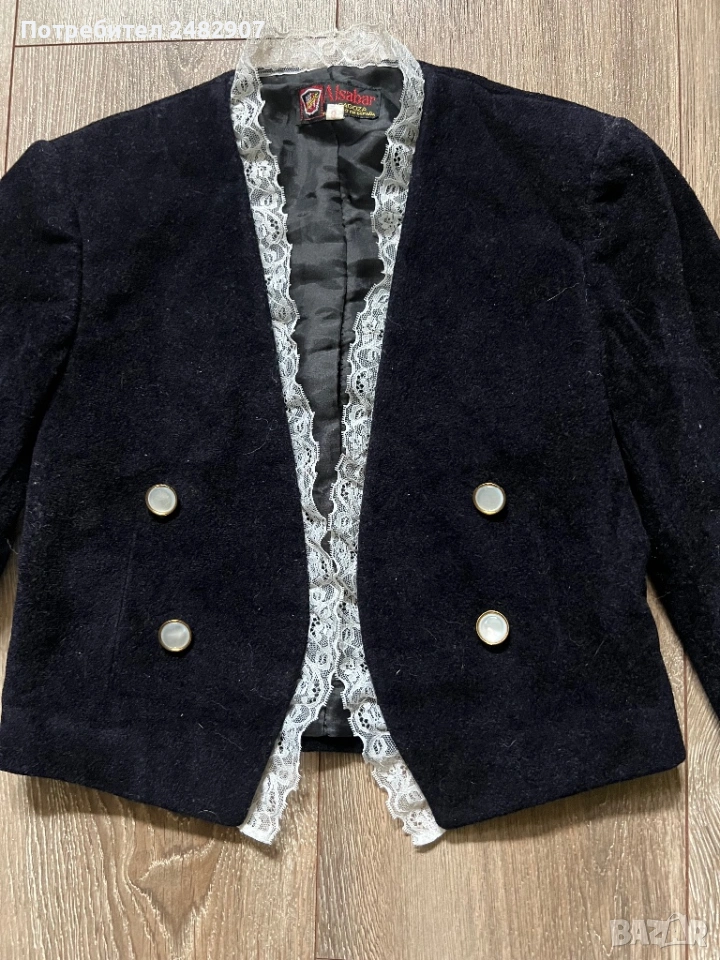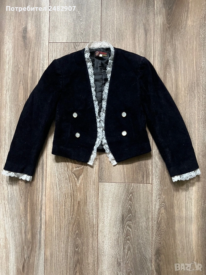 Черно кадифено детско сако с подплата и дантела за възраст - 7-8 години. Съдържа 100 % полиестер. Ширина в раменете - 31 см, ширина под мишниците - 35 см, ширина в долната част - 34 см, дължина от рамото до долу - 41 см, дължина на ръкава от рамото - 46 см, ширина на ръкава в долната част - 11 см. Много запазено, почти не е използвано, не се закопчава. Подходящо е за връхна дреха към народна носия.