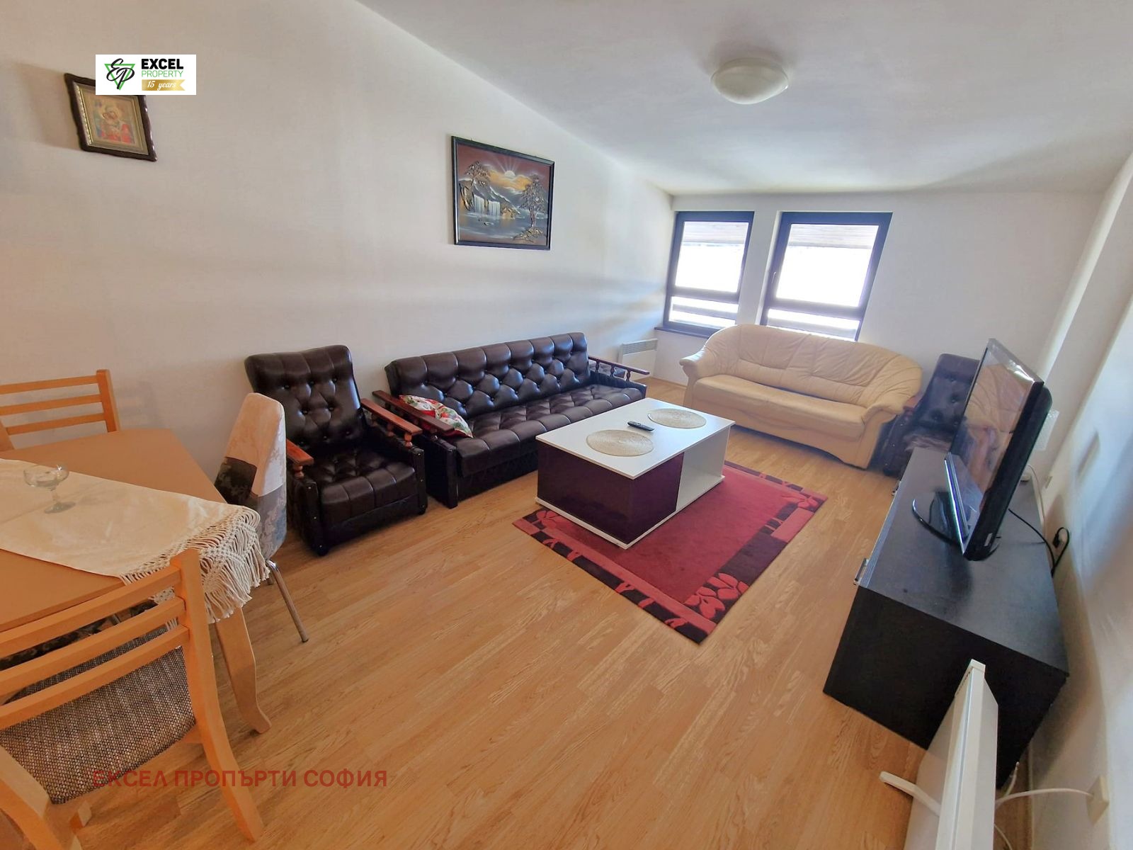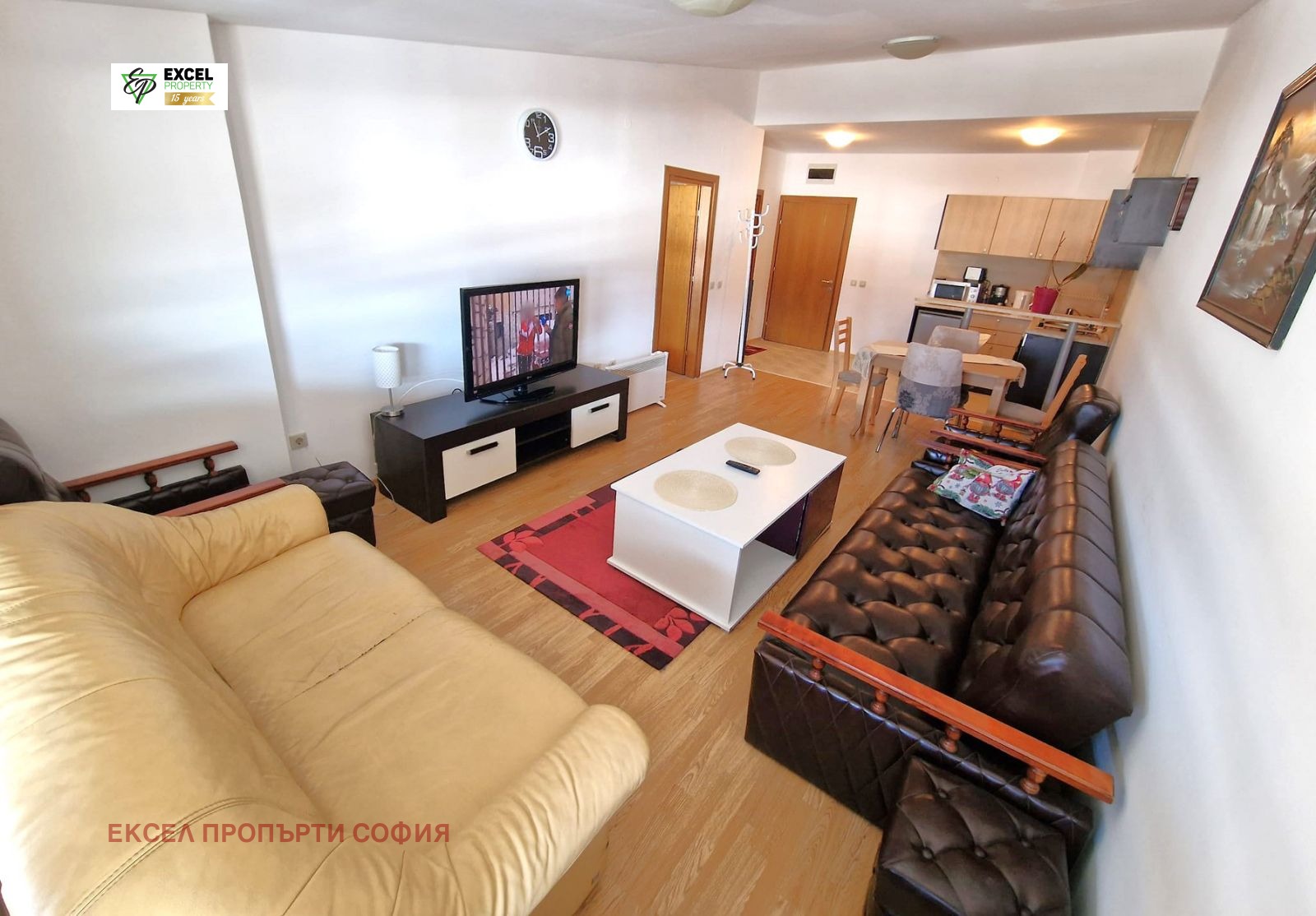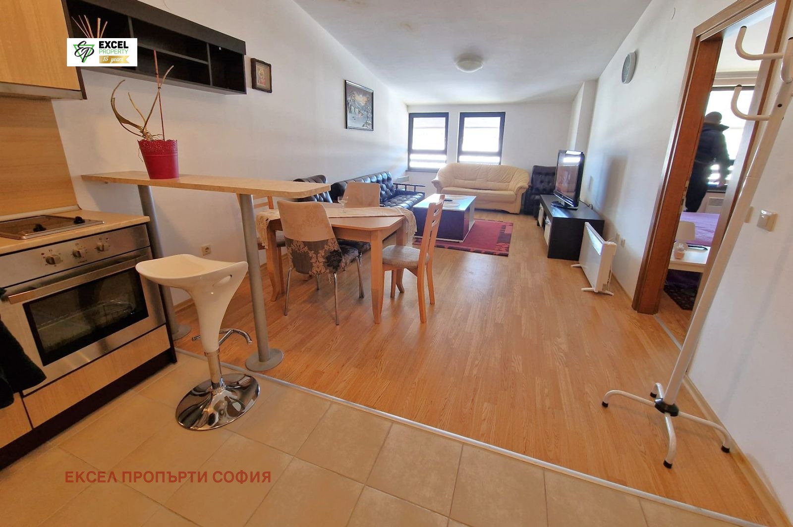 Разпределение: просторна дневна с трапезарна част и кухненски бокс, спалня, баня с тоалетна и тераса с южно изложение.