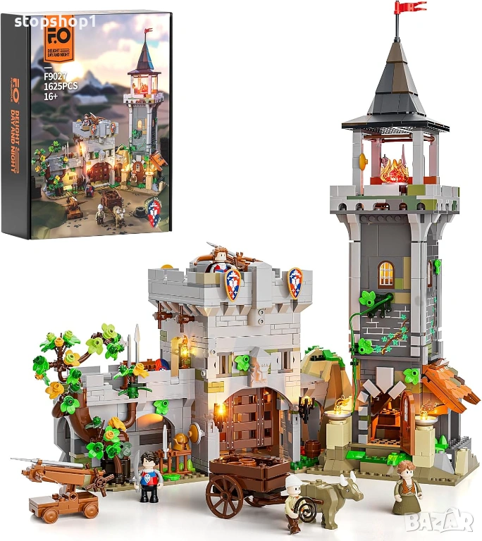 FUNWHOLE Комплект за осветление на средновековна наблюдателна кула - тухлички - замъкът пазител с минифигури на войник-фермер, колекционерски комплект, 1625 части за възрастни и тийнейджъри