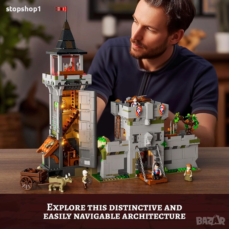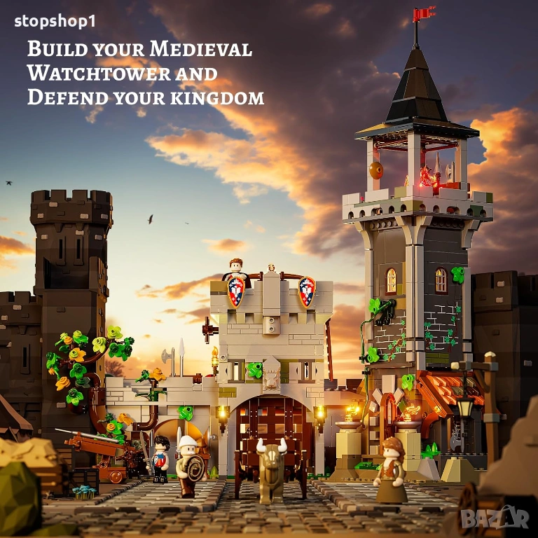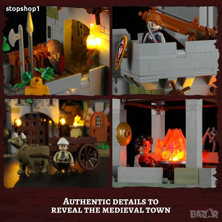 - 【Автентична средновековна архитектура】Изживейте величието на средновековната наблюдателна кула, включваща здрава градска порта и извисяваща се кула. Затворена в стените ѝ, открийте 10 осветени места, като например факли, осветяващи пътеката до портата. През нощта огън на върха на кулата хвърля топла светлина вътре. Комплектът включва 4 минифигури, каруца, теглена от волове, и защитен арбалет, създавайки спокойна средновековна градска сцена.