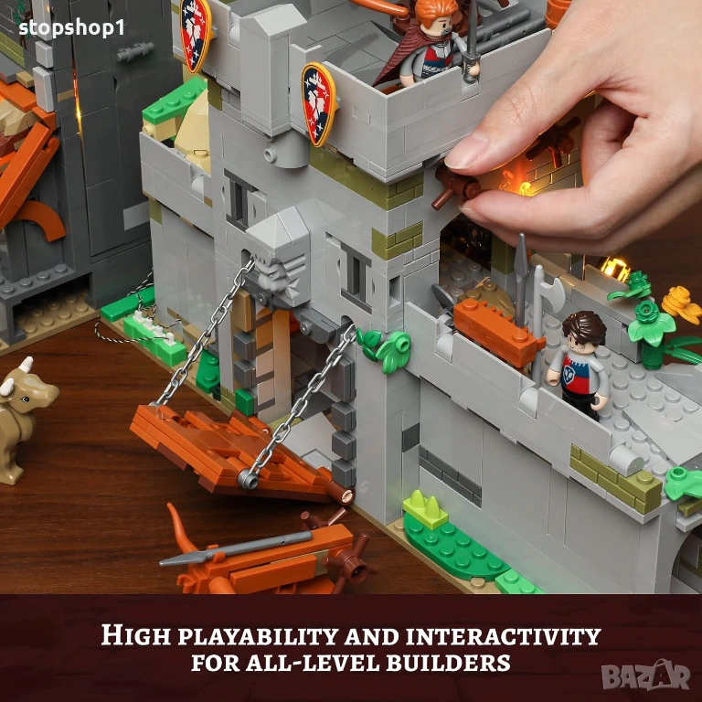 - 【Високо ниво на игра】Средновековната наблюдателна кула разполага с множество интерактивни дизайни, осигуряващи високо ниво на игра. Задната стена на кулата може да се обърне, за да се види лесно вътрешното оформление. Градската порта разполага с верижни механизми от двете страни за отваряне и затваряне. Свързващата конструкция между кулата и портата може да се завърта за по-лесно показване. Вътре в портата са скрити различни оръжия и съд с масло, които чакат да ги разгледате.