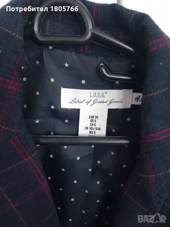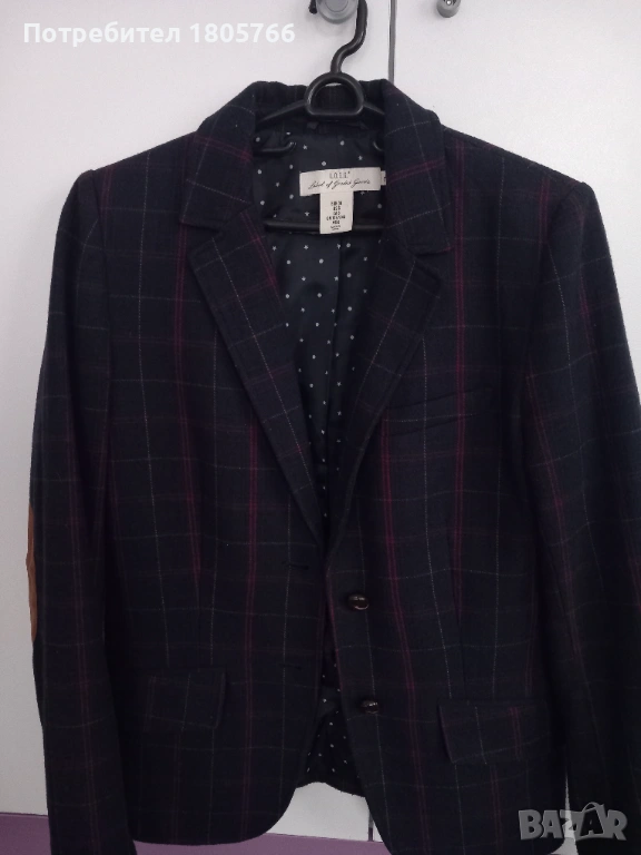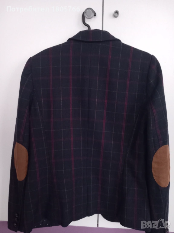 Късо сако, тъмно синьо каре, втален, елегантен модел. Без забележки.